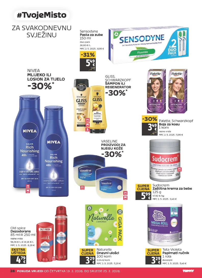 2 8 P O N U D A V RI J E DI O D Č E T V R T K A 1 9. 2. 2 0 2 6. D O S RI J E D E 2 5. 2. 2 0 2 6. Z A S V A K O D N E V N U S VJ E ŽI N U 5 4 9 7 9 9 - 3 1 % S e n s o d y n e P a s t a z a z u b e 1 5 0 ml d u o p a c k 3 6, 6 0 € / L M P C 2. 5. 2 0 2 5.: 8, 9 9 € G LI S S, S C H W A R Z K O P F Š A M P O N I LI R E G E N E R A T O R - 3 0 % * 3 4 9 4 9 9 - 3 0 % P al e tt e, S c h w ar z k o pf B oj a z a k o s u 1 k o m r a z n e vr st e M P C 2. 5. 2 0 2 5.: 5, 9 9 € NI V E A M LI J E K O I LI L O SI O N Z A TI J E L O - 3 0 % * V A S E LI N E P R OI Z V O DI Z A N J E G U K O Ž E - 3 0 % * S u d o cr e m Z a š ti t n a k r e m a z a b e b e 1 2 5 g 4 7, 9 2 € / k g M P C 2. 5. 2 0 2 5.: 9, 4 9 € 5 9 9 S U P E R CI J E N A Ol d s pi c e D e z o d o r a n s 8 5 ml ili 2 5 0 ml r a z n e vr st e 5 6, 3 6 € / L ili 1 9, 1 6 € / L M P C 2. 5. 2 0 2 5.: 8, 2 9 € 4 7 9 E K S T R A U Š T E D A N at ur ell a D n e v ni ul o š ci 1 0 0 k o m 0, 0 4 € / k o m M P C 2. 5. 2 0 2 5.: 5, 2 9 € 3 2 9 S U P E R CI J E N A T et a Vi ol et a P a pi r n a ti r u č ni k 1 r ol a d v o sl oj ni M P C 2. 5. 2 0 2 5.: 5, 4 9 € 3 2 9 S U P E R CI J E N A