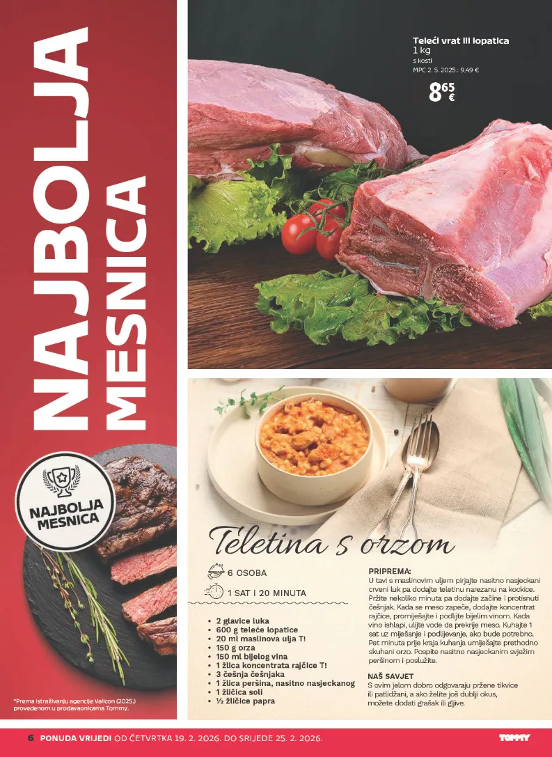 * P r e m a i s t r a ži v a nj u a g e n cij e V ali c o n ( 2 0 2 5.) p r o v e d e n o m u p r o d a v a o ni c a m a T o m m y. 6 P O N U D A V RI J E DI O D Č E T V R T K A 1 9. 2. 2 0 2 6. D O S RI J E D E 2 5. 2. 2 0 2 6. 8 65 T el e ći v r a t ili l o p a ti c a 1 k g s k o sti M P C 2. 5. 2 0 2 5.: 9, 4 9 € P RI P R E M A: U ta v i s m a sli no v i m ulj e m p irj ajte n a sit n o n a sj e c k a n i cr v e ni lu k p a d o d aj te te le ti n u n are z a n u na k o c ki c e . Pr žit e n e k oli k o mi n ut a pa d o d ajt e z a či n e i pro ti s n uti č e š nj a k. K a d a s e m e s o z a p e če , d o d ajt e k o n c e n tra t raj či c e , pro mij e š ajt e i p o dlijt e bij eli m vi n o m. K a d a v i n o i s hl ap i, ulijte v o d e d a p re k rij e m e so . K u h aj te 1 s a t u z mij e ša nj e i p o d lije v a nj e , ak o b u d e p o tre b n o . P e t mi n uta p rij e k raj a k u h a nj a u mij e š ajte p re th o d n o s k u h a ni or z o . P o s pit e n a sit n o n a sj e c k a ni m s vj e ži m p e rši n o m i p o s lu žit e . • 2 g la vi c e l u k a • 6 0 0 g t el e ć e l o p a ti c e • 2 0 m l m a sli no v a ulja T! • 1 5 0 g o r z a • 1 5 0 m l bij elo g vi n a • 1 žli c a k o n c e n t r a t a r aj či c e T! • 3 č e š nj a č e š nj ak a • 1 žli c a p er ši n a , n a si t n o n a sj e ck a n o g • 1 žli či c a s oli • ½ žli či c e p a p r a 6 O S O B A 1 S A T I 2 0 MI N U T A N A Š S A V J E T S o vi m j el o m d o b ro o d g o v a raj u pr ž e n e ti k vi ce ili pa tli d ž a ni, a ak o ž elit e j o š d u blji o k u s , m o ž e t e d o da ti gra š a k ili glji v e. Teleti n a s orz o m