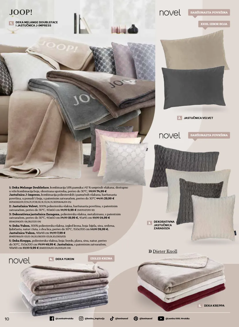10 @lesnina xxxl hrvatska @lesninahrvatska @lesninaxxxl @lesninaxxxl @lesnina_inspiracija 1: deka melange doubleface , kombinacija 58% pamuka i 42 % umjetnih vlakana, dostupno u više kombinacija boja, obostrana upotreba, perivo do 30°c, 99,99 74,99 € jastučnica j-impress, kombinacija poliesterskih i pamučnih vlakana, baršunasta površina, u ponudi 5 boja, s patentnim zatvaračem, perivo do 30°c 44,95 29,99 € (42190062/01,17,19,21,27,28,30,31,33,34,35;30210646/01-05) 2: jastučnica velvet, 100% poliesterska vlakna, baršunasta površina, s patentnim zatvaračem, perivo do 30°c, 40x60 cm 14,99 9,99 € (39170927/01-10) 3: dekorativna jastučnica zaragoza, poliesterska vlakna, metalizirano, s patentnim zatvaračem, perivo do 30°c, 40x60 cm 24,99 19,99 €, 45x45 cm 19,99 14,99 € (81960140/05-06,08,07,01-04) 4: deka yukon, 100% poliesterska vlakna, izgled krzna, boja: bijela, siva, srebrna, ljubičasta, natur i žuta, s dva lica, perivo do 30°c, 150x200 cm 59,99 39,99 €. jastučnica yukon, 48x48 cm 14,99 7,99 € (89820166/01-03,05-06,10;0167/01-03,06,10;0300/03) 5: deka kreppa, poliesterska vlakna, boja: bordo, plava, siva, natur, perivo do 30°c, 150x200 cm 79,99 49,99 €. jastučnica, s patentnim zatvaračem, 48x48 cm 19,99 9,99 € (89820334/01-04;0335/01-04) 1. deka melange doubleface i jastučnica j-impress 2. jastučnica velvet 4. deka yukon 5. deka kreppa 3. dekorativna jastučnica zaragoza baršunasta površina baršunasta površina izgled krzna xxxl izbor boja