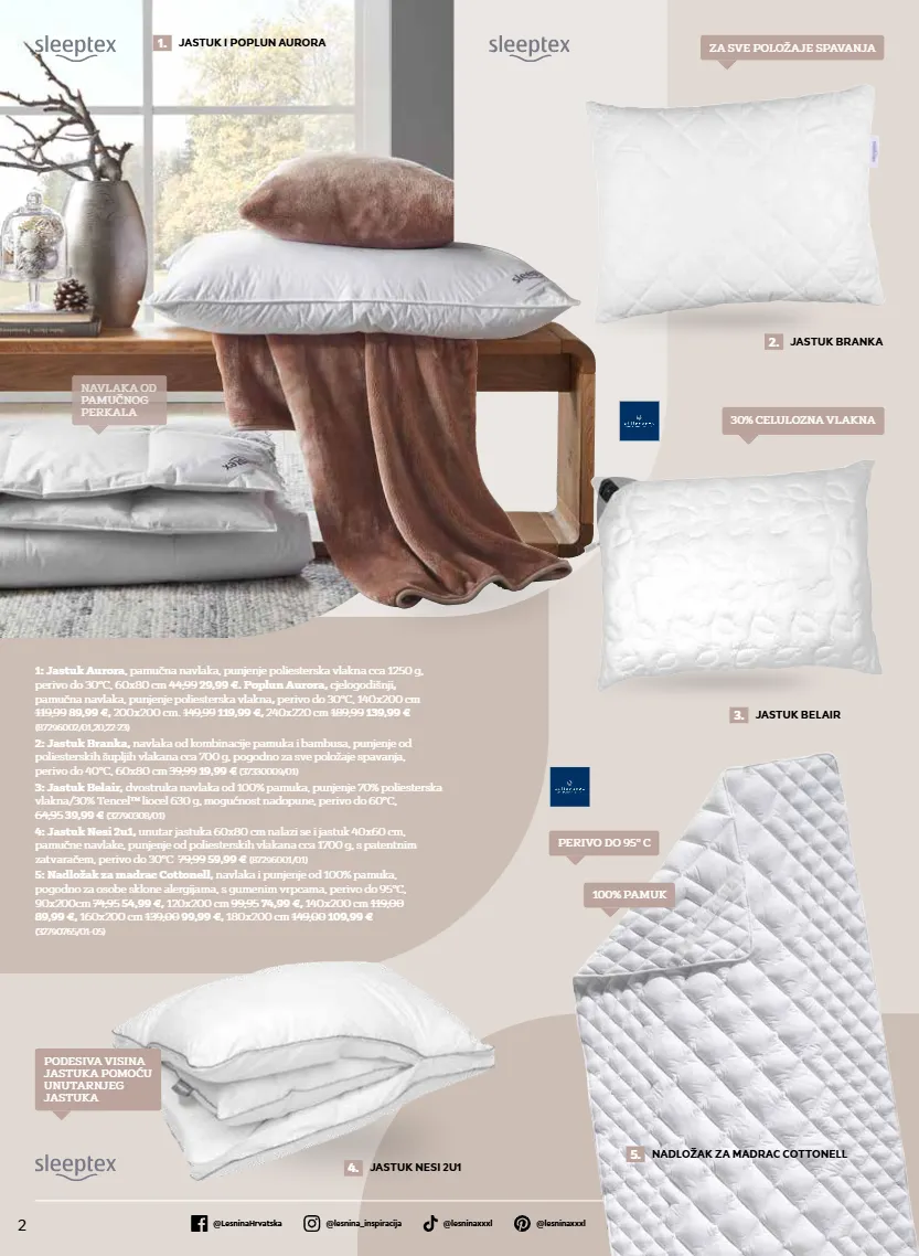 2 @lesnina xxxl hrvatska @lesninahrvatska @lesninaxxxl @lesninaxxxl @lesnina_inspiracija 1: jastuk aurora , pamučna navlaka, punjenje poliesterska vlakna cca 1250 g, perivo do 30°c, 60x80 cm 44,99 29,99 €. poplun aurora, cjelogodišnji , pamučna navlaka, punjenje poliesterska vlakna , perivo do 30°c, 140x200 cm 119,99 89,99 €, 200x200 cm. 149,99 119,99 €, 240x220 cm 189,99 139,99 € (87296002/01,20,22-23) 2: jastuk branka, navlaka od kombinacije pamuka i bambusa, punjenje od poliesterskih šupljih vlakana cca 700 g, pogodno za sve položaje spavanja, perivo do 40°c, 60x80 cm 39,99 19,99 € (37330009/01) 3: jastuk belair, dvostruka navlaka od 100% pamuka, punjenje 70% poliesterska vlakna/30% tencel™ liocel 630 g, mogućnost nadopune, perivo do 60°c, 64,95 39,99 € (32790308/01) 4: jastuk nesi 2u1, unutar jastuka 60x80 cm nalazi se i jastuk 40x60 cm, pamučne navlake, punjenje od poliesterskih vlakana cca 1700 g, s patentnim zatvaračem, perivo do 30°c 79,99 59,99 € (87296001/01) 5: nadložak za madrac cottonell, navlaka i punjenje od 100% pamuka, pogodno za osobe sklone alergijama, s gumenim vrpcama, perivo do 95°c, 90x200cm 74,95 54,99 €, 120x200 cm 99,95 74,99 €, 140x200 cm 119,00 89,99 €, 160x200 cm 139,00 99,99 €, 180x200 cm 149,00 109,99 € (32790765/01-05) 30% celulozna vlakna 1. jastuk i poplun aurora 2. jastuk branka 3. jastuk belair za sve položaje spavanja navlaka od pamučnog perkala 100% pamuk perivo do 95 ° c 5. nadložak za madrac cottonell 4. jastuk nesi 2u1 podesiva visina jastuka pomoću unutarnjeg jastuka