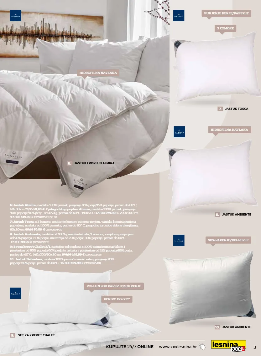 3 kupujte 24/7 online www.xxxlesnina.hr 6: jastuk almira, navlaka 100% pamuk, punjenje 85% perje/15% paperje, perivo do 60°c, 60x80 cm 74,95 59,90 €. cjelogodišnji poplun almira, navlaka 100% pamuk, punjenje 90% paperje/10% perje, cca 650 g, perivo do 60°c, 140x200 329,00 279,99 €, 200x200 cm 499,00 419,99 € (32790425/01,30,32) 7: jastuk tosca , s 3 komore, unutarnje komore punjene perjem, vanjska komora punjena paperjem, navlaka od 100% pamuka, perivo do 60° c, pogodno za osobe sklone alergijama, 60x80 cm 99,99 59,99 € (32790094/01) 8: jastuk ambiente , navlaka od 100% pamuka-batista, 3 komore, vanjske s punjenjem od 90% paperja i 10% perja i unutarnja od 70% perja i 30% paperja, perivo do 60°c, 129,00 99,99 € (32790952/01) 10: jastuk belvedere, navlaka 100% pamučni mako saten, punjenje 90% paperje/10% perje, perivo do 60°c, 169,00 129,99 € (32790095/01) 9: set za krevet chalet 2/1 , sastoji se od popluna s 100% pamučnom navlakom i punjenjem od 90% paperja/10% perja te jastuka s punjenjem od 15% paperja/85% perja, perivo do 60°c, 140x200/60x80 cm 249,99 149,99 € (32790313/02) 7. jastuk tosca 8. jastuk ambiente 10. jastuk ambiente hidrofilna navlaka 3 komore hidrofilna navlaka 90% paperje/10% perje punjenje perje/paperje 6. jastuk i poplun almira 9. set za krevet chalet perivo do 60°c poplun 90% paperje/10% perje