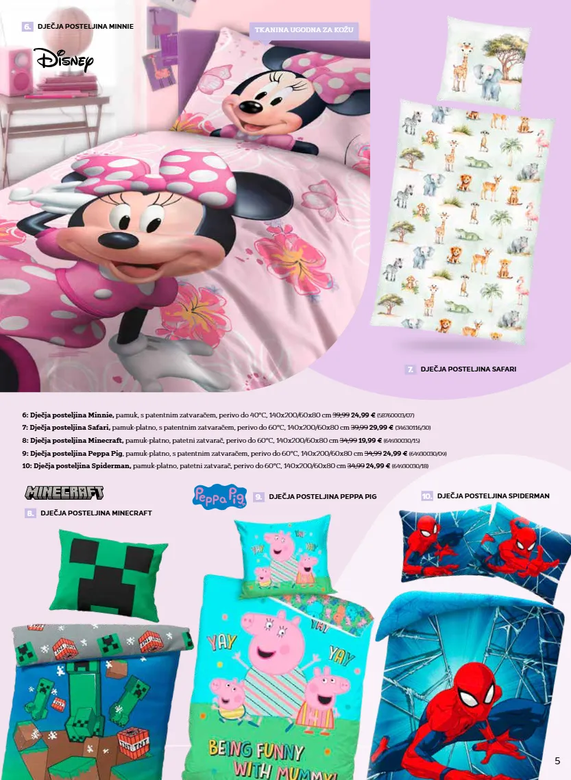 5 6: dječja posteljina minnie, pamuk, s patentnim zatvaračem, perivo do 40°c, 140x200/60x80 cm 39,99 24,99 € (58760003/07) 8: dječja posteljina minecraft, pamuk-platno, patetni zatvarač, perivo do 60°c, 140x200/60x80 cm 34,99 19,99 € (64930030/15) 10: dječja posteljina spiderman, pamuk-platno, patetni zatvarač, perivo do 60°c, 140x200/60x80 cm 34,99 24,99 € (64930030/18) 9: dječja posteljina peppa pig , pamuk-platno, s patentnim zatvaračem, perivo do 60°c, 140x200/60x80 cm 34,99 24,99 € (64930030/09) 7: dječja posteljina safari, pamuk-platno, s patentnim zatvaračem, perivo do 60°c, 140x200/60x80 cm 39,99 29,99 € (34630116/30) 7. dječja posteljina safari 8. dječja posteljina minecraft 6. dječja posteljina minnie tkanina ugodna za kožu 10. dječja posteljina spiderman 9. dječja posteljina peppa pig