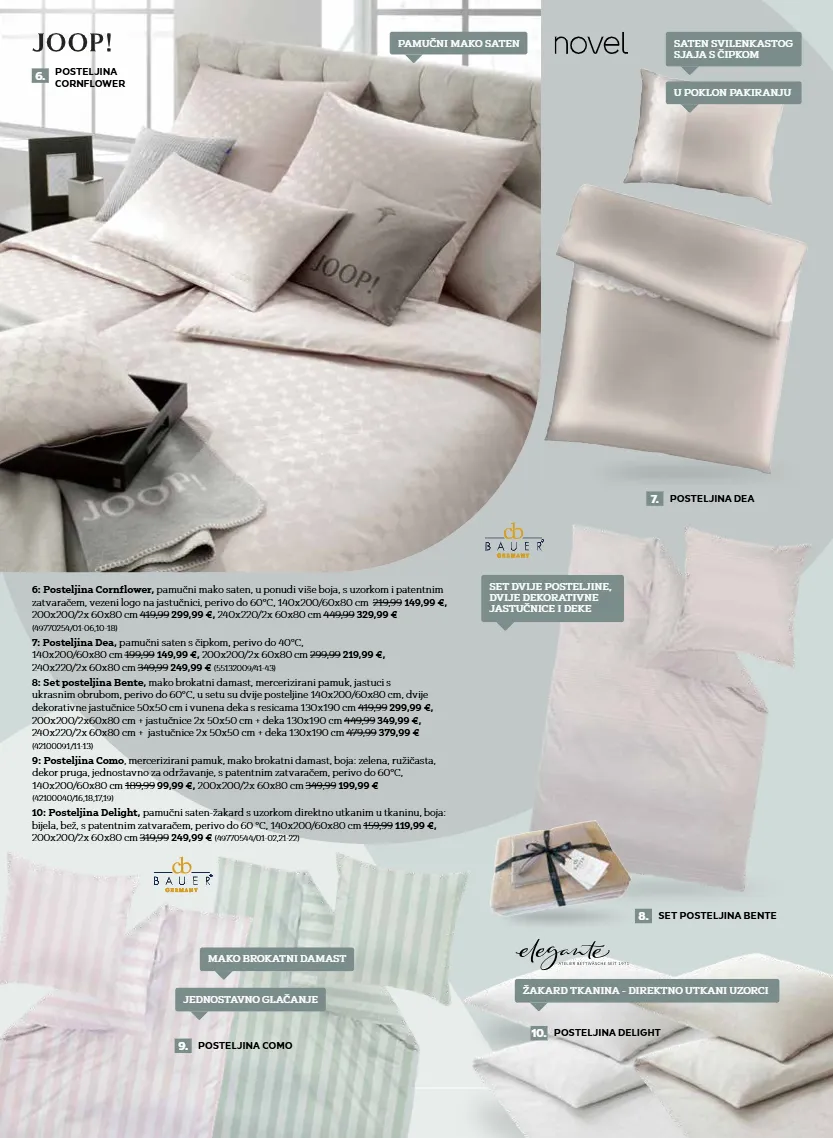 7 6: posteljina cornflower, pamučni mako saten, u ponudi više boja, s uzorkom i patentnim zatvaračem, vezeni logo na jastučnici, perivo do 60°c, 140x200/60x80 cm 219,99 149,99 €, 200x200/2x 60x80 cm 419,99 299,99 €, 240x220/2x 60x80 cm 449,99 329,99 € (49770254/01-06,10-18) 9: posteljina como , mercerizirani pamuk, mako brokatni damast, boja: zelena, ružičasta, dekor pruga, jednostavno za održavanje, s patentnim zatvaračem, perivo do 60°c, 140x200/60x80 cm 189,99 99,99 €, 200x200/2x 60x80 cm 349,99 199,99 € (42100040/16,18,17,19) 10: posteljina delight, pamučni saten-žakard s uzorkom direktno utkanim u tkaninu, boja: bijela, bež, s patentnim zatvaračem, perivo do 60 °c, 140x200/60x80 cm 159,99 119,99 €, 200x200/2x 60x80 cm 319,99 249,99 € (49770544/01-02,21-22) 7: posteljina dea, pamučni saten s čipkom, perivo do 40°c, 140x200/60x80 cm 199,99 149,99 €, 200x200/2x 60x80 cm 299,99 219,99 €, 240x220/2x 60x80 cm 349,99 249,99 € (55132009/41-43) 6. posteljina cornflower pamučni mako saten u poklon pakiranju 8: set posteljina bente, mako brokatni damast, mercerizirani pamuk, jastuci s ukrasnim obrubom, perivo do 60°c, u setu su dvije posteljine 140x200/60x80 cm, dvije dekorativne jastučnice 50x50 cm i vunena deka s resicama 130x190 cm 419,99 299,99 €, 200x200/2x60x80 cm + jastučnice 2x 50x50 cm + deka 130x190 cm 449,99 349,99 €, 240x220/2x 60x80 cm + jastučnice 2x 50x50 cm + deka 130x190 cm 479,99 379,99 € (42100091/11-13) saten svilenkastog sjaja s čipkom set dvije posteljine, dvije dekorativne jastučnice i deke 8. set posteljina bente 7. posteljina dea žakard tkanina - direktno utkani uzorci 10. posteljina delight mako brokatni damast jednostavno glačanje 9. posteljina como