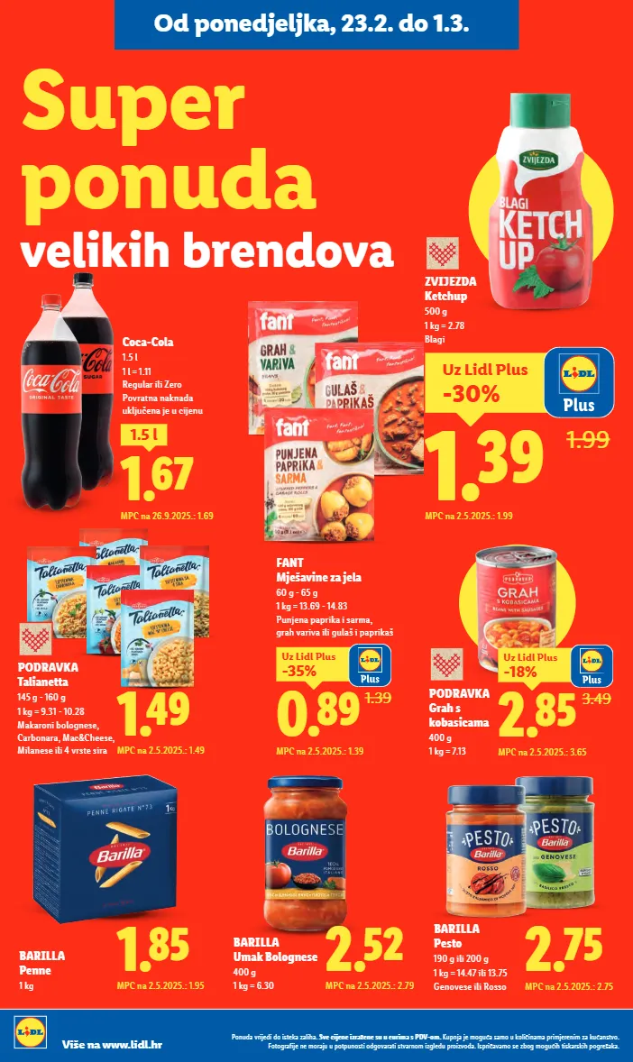 1.49 mpc na 2.5.2025.: 1.49 podravka talianetta 145 g - 160 g 1 kg = 9.31 - 10.28 makaroni bolognese, carbonara, mac&cheese, milanese ili 4 vrste sira coca-cola 1.5 l 1 l = 1.11 regular ili zero povratna naknada uključena je u cijenu barilla umak bolognese 400 g 1 kg = 6.30 1.85 mpc na 2.5.2025.: 1.95 barilla penne 1 kg 2.75 mpc na 2.5.2025.: 2.75 barilla pesto 190 g ili 200 g 1 kg = 14.47 ili 13.75 genovese ili rosso 1.67 1.5 l mpc na 26.9.2025.: 1.69 podravka grah s kobasicama 400 g 1 kg = 7.13 2.52 mpc na 2.5.2025.: 2.79 zvijezda ketchup 500 g 1 kg = 2.78 blagi fant mješavine za jela 60 g - 65 g 1 kg = 13.69 - 14.83 punjena paprika i sarma, grah variva ili gulaš i paprikaš 1.39 0.89 -35% uz lidl plus mpc na 2.5.2025.: 1.39 3.49 2.85 -18% uz lidl plus mpc na 2.5.2025.: 3.65 uz lidl plus -30% 1.39 1.99 mpc na 2.5.2025.: 1.99 super ponuda velikih brendova ponuda vrijedi do isteka zaliha. sve cijene izražene su u eurima s pdv-om. kupnja je moguća samo u količinama primjerenim za kućanstvo. fotografije ne moraju u potpunosti odgovarati stvarnom izgledu proizvoda. ispričavamo se zbog mogućih tiskarskih pogrešaka. više na www.lidl.hr od ponedjeljka, 23.2. do 1.3.