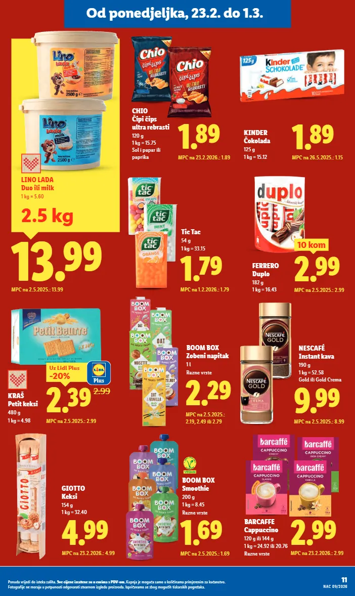 9.99 mpc na 2.5.2025.: 8.99 1.89 mpc na 26.5.2025.: 1.15 1.89 mpc na 23.2.2026.: 1.89 4.99 mpc na 23.2.2026.: 4.99 ferrero duplo 182 g 1 kg = 16.43 chio čipi čips ultra rebrasti 120 g 1 kg = 15.75 sol i papar ili paprika giotto keksi 154 g 1 kg = 32.40 nescafé instant kava 190 g 1 kg = 52.58 gold ili gold crema kinder čokolada 125 g 1 kg = 15.12 2.99 mpc na 23.2.2026.: 2.99 1.79 mpc na 1.2.2026.: 1.79 2.29 mpc na 2.5.2025.: 2.19, 2.49 ili 2.79 barcaffe cappuccino 120 g ili 144 g 1 kg = 24.92 ili 20.76 razne vrste tic tac 54 g 1 kg = 33.15 boom box zobeni napitak 1 l razne vrste 2.99 10 kom mpc na 2.5.2025.: 2.99 13.99 mpc na 2.5.2025.: 13.99 2.5 kg lino lada duo ili milk 1 kg = 5.60 kraš petit keksi 480 g 1 kg = 4.98 2.99 2.39 -20% uz lidl plus mpc na 2.5.2025.: 2.99 1.69 mpc na 2.5.2025.: 1.69 boom box smoothie 200 g 1 kg = 8.45 razne vrste 11 nac 09/2026 ponuda vrijedi do isteka zaliha. sve cijene izražene su u eurima s pdv-om. kupnja je moguća samo u količinama primjerenim za kućanstvo. fotografije ne moraju u potpunosti odgovarati stvarnom izgledu proizvoda. ispričavamo se zbog mogućih tiskarskih pogrešaka. od ponedjeljka, 23.2. do 1.3.