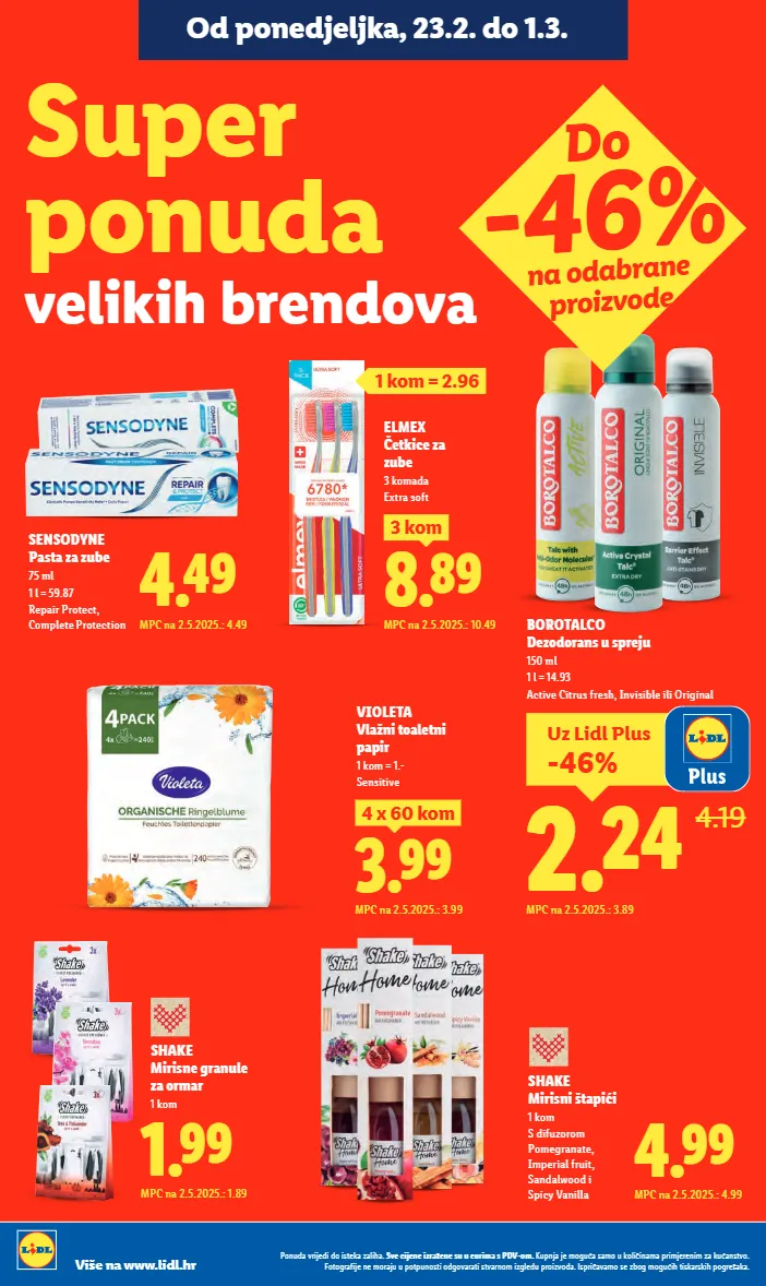 violeta vlažni toaletni papir 1 kom = 1.- sensitive 4.49 mpc na 2.5.2025.: 4.49 sensodyne pasta za zube 75 ml 1 l = 59.87 repair protect, complete protection elmex četkice za zube 3 komada extra soft 1 kom = 2.96 shake mirisni štapići 1 kom s difuzorom pomegranate, imperial fruit, sandalwood i spicy vanilla 4.99 mpc na 2.5.2025.: 4.99 shake mirisne granule za ormar 1 kom 1.99 mpc na 2.5.2025.: 1.89 3.99 4 x 60 kom mpc na 2.5.2025.: 3.99 8.89 3 kom mpc na 2.5.2025.: 10.49 super ponuda velikih brendova od ponedjeljka, 23.2. do 1.3. borotalco dezodorans u spreju 150 ml 1 l = 14.93 active citrus fresh, invisible ili original uz lidl plus -46% 2.24 4.19 mpc na 2.5.2025.: 3.89 do -46% na odabrane proizvode ponuda vrijedi do isteka zaliha. sve cijene izražene su u eurima s pdv-om. kupnja je moguća samo u količinama primjerenim za kućanstvo. fotografije ne moraju u potpunosti odgovarati stvarnom izgledu proizvoda. ispričavamo se zbog mogućih tiskarskih pogrešaka. više na www.lidl.hr