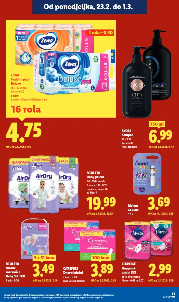 syoss šampon 1 l = 9.32 keratin ili anti-dandruff carefree dnevni ulošci 1 kom = 0.04 aloe vera ili normal violeta baby pelene 96 - 120 komada 1 kom = 0.17 - 0.21 junior 5, junior +6 ili maxi 4 violeta vlažne maramice baby soft xxl 1 pak = 0.70 3.69 mpc na 19.1.2026.: 3.69 melem za usne 4.5 g 2.99 mpc na 2.5.2025.: 2.99 libresse higijenski ulošci xxl 36 ili 40 komada 1 kom = 0.08 ili 0.07 6.99 750 ml mpc na 2.5.2025.: 6.45 3.89 100 kom mpc na 2.5.2025.: 3.89 3.49 5 x 51 kom mpc na 2.5.2025.: 3.49 19.99 mpc na 2.5.2025.: 19.99 od ponedjeljka, 23.2. do 1.3. 4.75 mpc na 2.5.2025.: 4.99 16 rola zewa toaletni papir deluxe 16 x 150 listića 1 rola = 0.30 3-slojni cashmere peach ili delicate care 1 rola = 0.30 13 ponuda vrijedi do isteka zaliha. sve cijene izražene su u eurima s pdv-om. kupnja je moguća samo u količinama primjerenim za kućanstvo. fotografije ne moraju u potpunosti odgovarati stvarnom izgledu proizvoda. ispričavamo se zbog mogućih tiskarskih pogrešaka. nac 09/2026