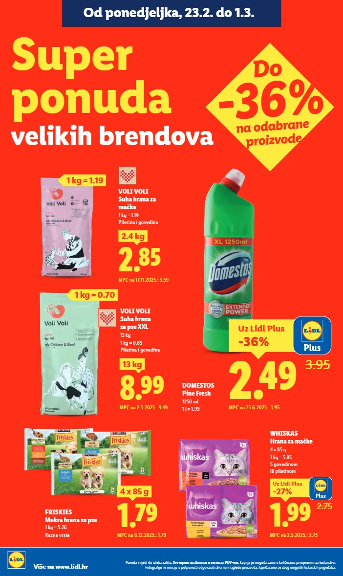 voli voli suha hrana za mačke 1 kg = 1.19 piletina i govedina friskies mokra hrana za pse 1 kg = 5.26 razne vrste voli voli suha hrana za pse xxl 13 kg 1 kg = 0.69 piletina i govedina 2.85 2.4 kg mpc na 17.11.2025.: 3.59 8.99 13 kg mpc na 2.5.2025.: 9.49 1.79 4 x 85 g mpc na 8.12.2025.: 1.79 1 kg = 1.19 1 kg = 0.70 whiskas hrana za mačke 4 x 85 g 1 kg = 5.85 s govedinom ili piletinom 2.75 1.99 -27% uz lidl plus mpc na 2.5.2025.: 2.75 do -36% na odabrane proizvode super ponuda velikih brendova domestos pine fresh 1250 ml 1 l = 1.99 uz lidl plus -36% 2.49 3.95 mpc na 25.6.2025.: 3.95 ponuda vrijedi do isteka zaliha. sve cijene izražene su u eurima s pdv-om. kupnja je moguća samo u količinama primjerenim za kućanstvo. fotografije ne moraju u potpunosti odgovarati stvarnom izgledu proizvoda. ispričavamo se zbog mogućih tiskarskih pogrešaka. više na www.lidl.hr od ponedjeljka, 23.2. do 1.3.