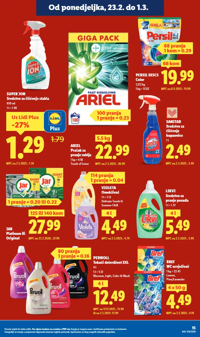 perwoll tekući deterdžent xxl 4 l 1 l = 3.12 blossom, light, color ili black persil discs color 1,122 kg 1 kg = 17.82 ariel prašak za pranje rublja 1 kg = 4.18 touch of lenor jar platinum ili original bref wc osvježivač 1 kg = 22.45 lemon, pine/lavander 100 pranja 1 pranje = 0.23 68 pranja 1 kom = 0.29 likvi sredstvo za pranje posuđa 1 l = 1.37 violeta omekšivač 1 l = 1.12 delicate touch ili summer chill sanitar sredstvo za čišćenje kupaonice 1 l 2.49 mpc na 2.5.2025.: 2.49 114 pranja 1 pranje = 0.04 19.99 68 kom mpc na 8.9.2025.: 19.99 5.49 4 l mpc na 2.5.2025.: 5.99 4.49 4 l mpc na 2.5.2025.: 4.79 12.49 4 l mpc na 17.11.2025.: 13.99 ili na 2.5.2025: 13.99 4.49 4 x 50 g mpc na 2.5.2025.: 4.19 22.99 5.5 kg mpc na 2.5.2025.: 26.99 27.99 125 ili 140 kom mpc na 23.2.2026.: 27.99 super jon sredstvo za čišćenje stakla 650 ml 1 l = 1.98 uz lidl plus -27% 1.29 1.79 mpc na 2.5.2025.: 1.59 80 pranja 1 pranje = 0.16 1 pranje = 0.20 ili 0.22 15 nac 09/2026 ponuda vrijedi do isteka zaliha. sve cijene izražene su u eurima s pdv-om. kupnja je moguća samo u količinama primjerenim za kućanstvo. fotografije ne moraju u potpunosti odgovarati stvarnom izgledu proizvoda. ispričavamo se zbog mogućih tiskarskih pogrešaka. od ponedjeljka, 23.2. do 1.3.