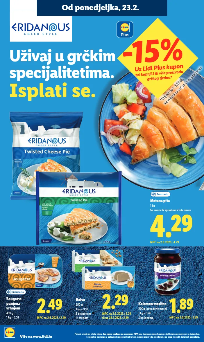 ponuda vrijedi do isteka zaliha. sve cijene izražene su u eurima s pdv-om. kupnja je moguća samo u količinama primjerenim za kućanstvo. fotografije ne moraju u potpunosti odgovarati stvarnom izgledu proizvoda. ispričavamo se zbog mogućih tiskarskih pogrešaka. više na www.lidl.hr 1.89 mpc na 2.6.2025.: 1.89 kalamon masline 200g (ocijeđene mase) 1 kg = 9.45 s košticama 4.29 mpc na 2.6.2025.: 4.29 motana pita 1 kg sa sirom ili špinatom i feta sirom uživaj u grčkim specijalitetima. isplati se. 2.29 mpc na 2.6.2025.: 2.29 ili na 28.7.2025.: 2.49 halva 250 g 1 kg = 9.16 s pistacijom ili medom 2.49 mpc na 2.6.2025.: 2.49 bougatsa punjena vrhnjem 450 g 1 kg = 5.53 -15% uz lidl plus kupon pri kupnji 3 ili više proizvoda grčkog tjedna* *vrijedi do 1. 3.2026. ne vrijedi za već snižene proizvode od ponedjeljka, 23.2.