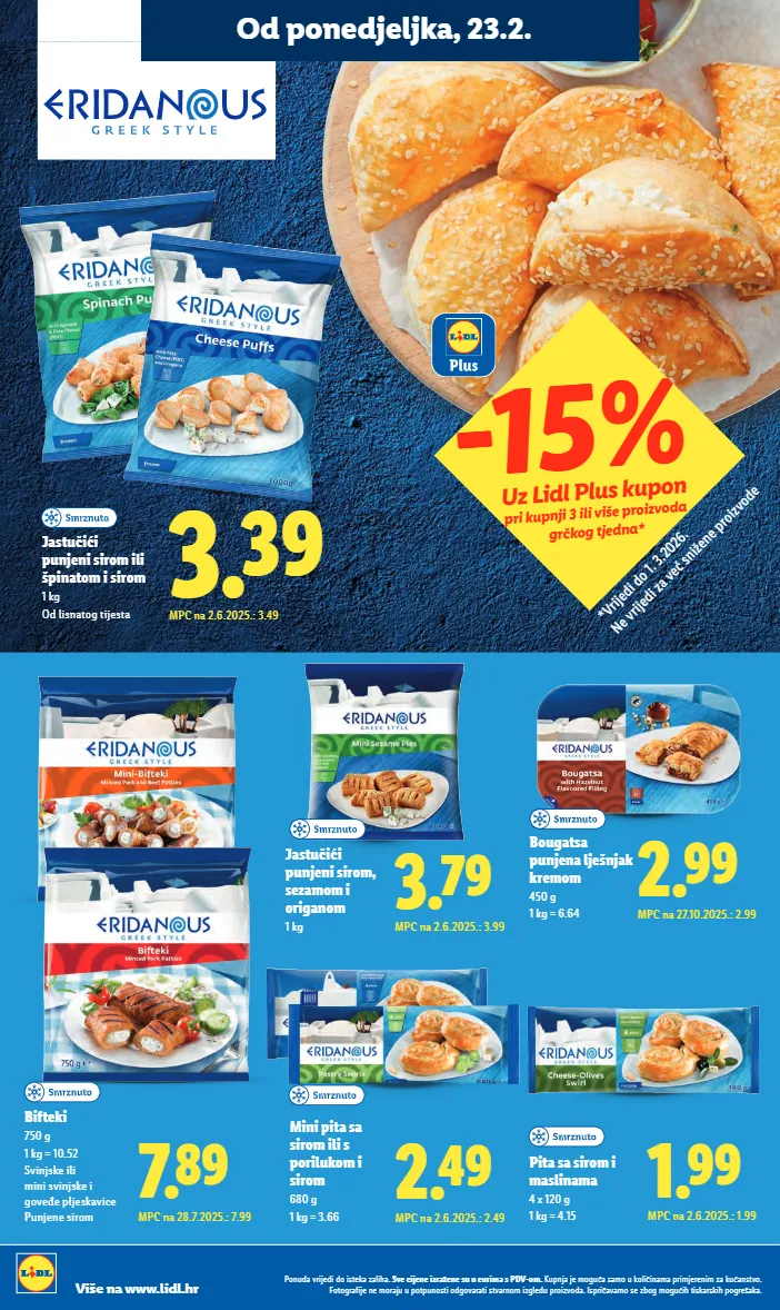 ponuda vrijedi do isteka zaliha. sve cijene izražene su u eurima s pdv-om. kupnja je moguća samo u količinama primjerenim za kućanstvo. fotografije ne moraju u potpunosti odgovarati stvarnom izgledu proizvoda. ispričavamo se zbog mogućih tiskarskih pogrešaka. više na www.lidl.hr 7.89 mpc na 28.7.2025.: 7.99 bifteki 750 g 1 kg = 10.52 svinjske ili mini svinjske i goveđe pljeskavice punjene sirom 2.99 mpc na 27.10.2025.: 2.99 bougatsa punjena lješnjak kremom 450 g 1 kg = 6.64 2.49 mpc na 2.6.2025.: 2.49 mini pita sa sirom ili s porilukom i sirom 680 g 1 kg = 3.66 1.99 mpc na 2.6.2025.: 1.99 pita sa sirom i maslinama 4 x 120 g 1 kg = 4.15 jastučići punjeni sirom ili špinatom i sirom 1 kg od lisnatog tijesta 3.39 mpc na 2.6.2025.: 3.49 3.79 mpc na 2.6.2025.: 3.99 jastučići punjeni sirom, sezamom i origanom 1 kg -15% uz lidl plus kupon pri kupnji 3 ili više proizvoda grčkog tjedna* *vrijedi do 1. 3.2026. ne vrijedi za već snižene proizvode od ponedjeljka, 23.2.