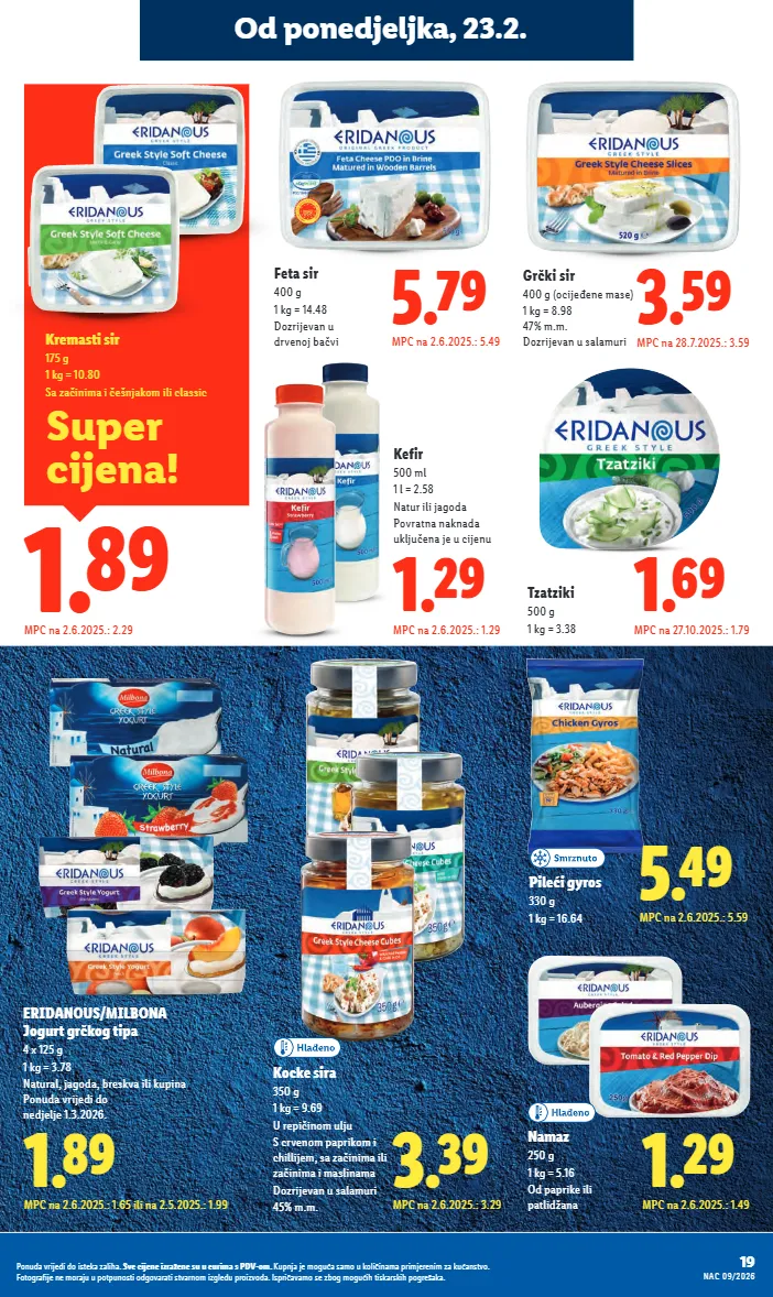 19 ponuda vrijedi do isteka zaliha. sve cijene izražene su u eurima s pdv-om. kupnja je moguća samo u količinama primjerenim za kućanstvo. fotografije ne moraju u potpunosti odgovarati stvarnom izgledu proizvoda. ispričavamo se zbog mogućih tiskarskih pogrešaka. nac 09/2026 1.89 mpc na 2.6.2025.: 2.29 super cijena! kremasti sir 175 g 1 kg = 10.80 sa začinima i češnjakom ili classic 1.29 mpc na 2.6.2025.: 1.29 kefir 500 ml 1 l = 2.58 natur ili jagoda povratna naknada uključena je u cijenu 3.59 mpc na 28.7.2025.: 3.59 grčki sir 400 g (ocijeđene mase) 1 kg = 8.98 47% m.m. dozrijevan u salamuri 5.79 mpc na 2.6.2025.: 5.49 feta sir 400 g 1 kg = 14.48 dozrijevan u drvenoj bačvi 1.69 mpc na 27.10.2025.: 1.79 tzatziki 500 g 1 kg = 3.38 5.49 mpc na 2.6.2025.: 5.59 pileći gyros 330 g 1 kg = 16.64 od ponedjeljka, 23.2. 3.39 mpc na 2.6.2025.: 3.29 kocke sira 350 g 1 kg = 9.69 u repičinom ulju s crvenom paprikom i chillijem, sa začinima ili začinima i maslinama dozrijevan u salamuri 45% m.m. 1.29 mpc na 2.6.2025.: 1.49 namaz 250 g 1 kg = 5.16 od paprike ili patlidžana 1.89 mpc na 2.6.2025.: 1.65 ili na 2.5.2025.: 1.99 eridanous/milbona jogurt grčkog tipa 4 x 125 g 1 kg = 3.78 natural, jagoda, breskva ili kupina ponuda vrijedi do nedjelje 1.3.2026.