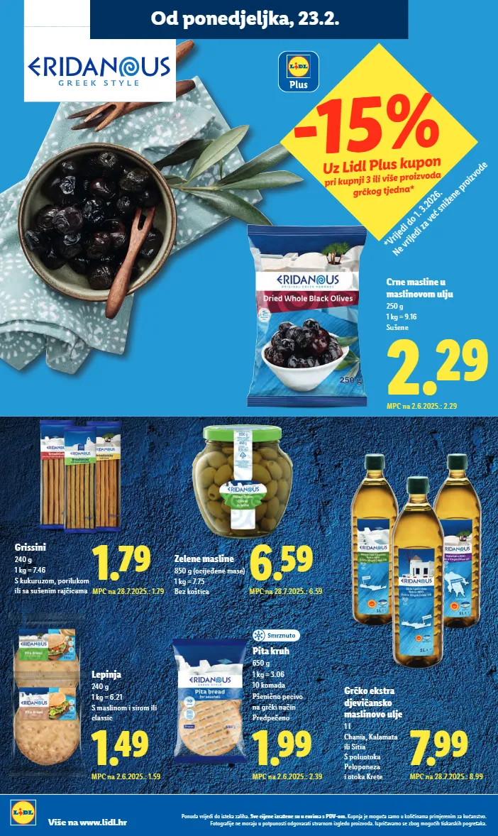 ponuda vrijedi do isteka zaliha. sve cijene izražene su u eurima s pdv-om. kupnja je moguća samo u količinama primjerenim za kućanstvo. fotografije ne moraju u potpunosti odgovarati stvarnom izgledu proizvoda. ispričavamo se zbog mogućih tiskarskih pogrešaka. više na www.lidl.hr 1.79 mpc na 28.7.2025.: 1.79 grissini 240 g 1 kg = 7.46 s kukuruzom, porilukom ili sa sušenim rajčicama 1.99 mpc na 2.6.2025.: 2.39 pita kruh 650 g 1 kg = 3.06 10 komada pšenično pecivo na grčki način predpečeno 1.49 mpc na 2.6.2025.: 1.59 lepinja 240 g 1 kg = 6.21 s maslinom i sirom ili classic 6.59 mpc na 28.7.2025.: 6.59 zelene masline 850 g (ocijeđene mase) 1 kg = 7.75 bez koštica 7.99 mpc na 28.7.2025.: 8.99 grčko ekstra djevičansko maslinovo ulje 1 l chania, kalamata ili sitia s poluotoka peloponeza i otoka krete 2.29 mpc na 2.6.2025.: 2.29 -15% uz lidl plus kupon pri kupnji 3 ili više proizvoda grčkog tjedna* *vrijedi do 1. 3.2026. ne vrijedi za već snižene proizvode crne masline u maslinovom ulju 250 g 1 kg = 9.16 sušene od ponedjeljka, 23.2.