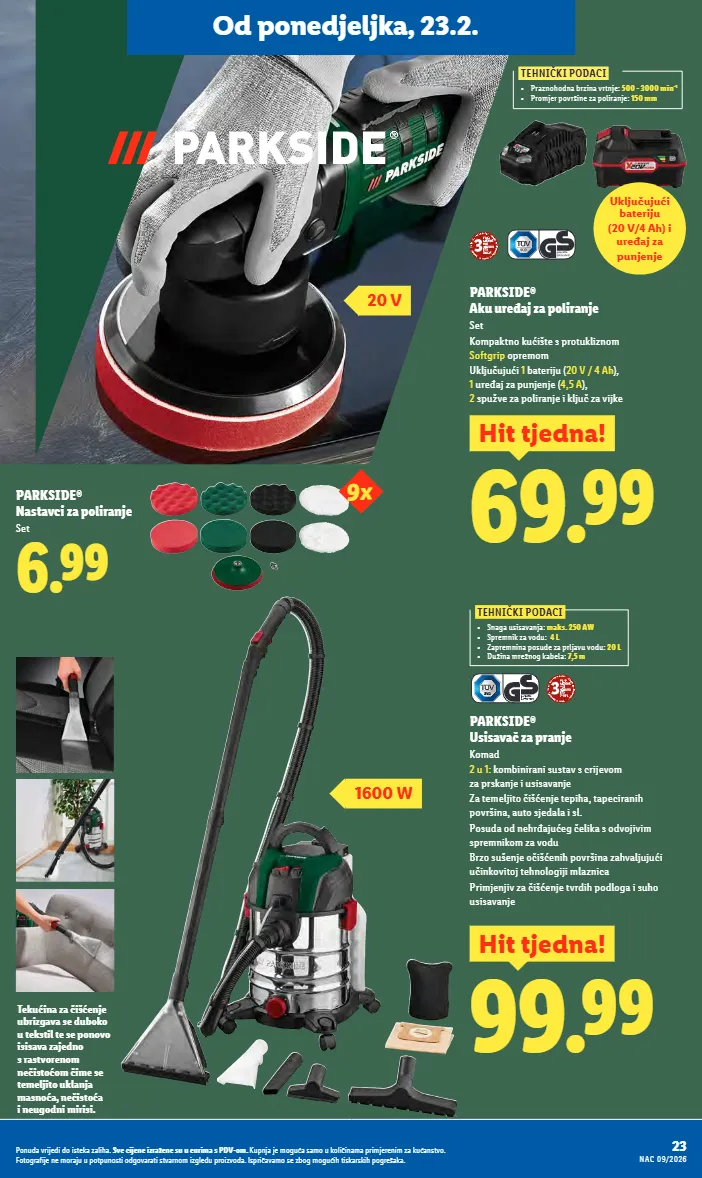 TEHNIČKI PODACI • Snaga usisavanja: maks. 250 AW • Spremnik za vodu: 4 L • Zapremnina posude za prljavu vodu: 20 L • Dužina mrežnog kabela: 7,5 m Od ponedjeljka, 23.2. Tekućina za čišćenje ubrizgava se duboko u tekstil te se ponovo isisava zajedno s rastvorenom nečistoćom čime se temeljito uklanja masnoća, nečistoća i neugodni mirisi. PARKSIDE ® Usisavač za pranje Komad 2 u 1: kombinirani sustav s crijevom za prskanje i usisavanje Za temeljito čišćenje tepiha, tapeciranih površina, auto sjedala i sl. Posuda od nehrđajućeg čelika s odvojivim spremnikom za vodu Brzo sušenje očišćenih površina zahvaljujući učinkovitoj tehnologiji mlaznica Primjenjiv za čišćenje tvrdih podloga i suho usisavanje 99.99 Hit tjedna! 1600 W PARKSIDE ® Aku uređaj za poliranje Set Kompaktno kućište s protukliznom Softgrip opremom Uključujući 1 bateriju ( 20 V / 4 Ah ), 1 uređaj za punjenje ( 4,5 A ), 2 spužve za poliranje i ključ za vijke 69.99 Hit tjedna! 20 V TEHNIČKI PODACI • Praznohodna brzina vrtnje: 500 - 3000 min -1 • Promjer površine za poliranje: 150 mm 6.99 PARKSIDE ® Nastavci za poliranje Set 9x Uključujući bateriju (20 V/4 Ah) i uređaj za punjenje 23 NAC 09/2026 Ponuda vrijedi do isteka zaliha. Sve cijene izražene su u eurima s PDV-om. Kupnja je moguća samo u količinama primjerenim za kućanstvo. Fotografije ne moraju u potpunosti odgovarati stvarnom izgledu proizvoda. Ispričavamo se zbog mogućih tiskarskih pogrešaka.