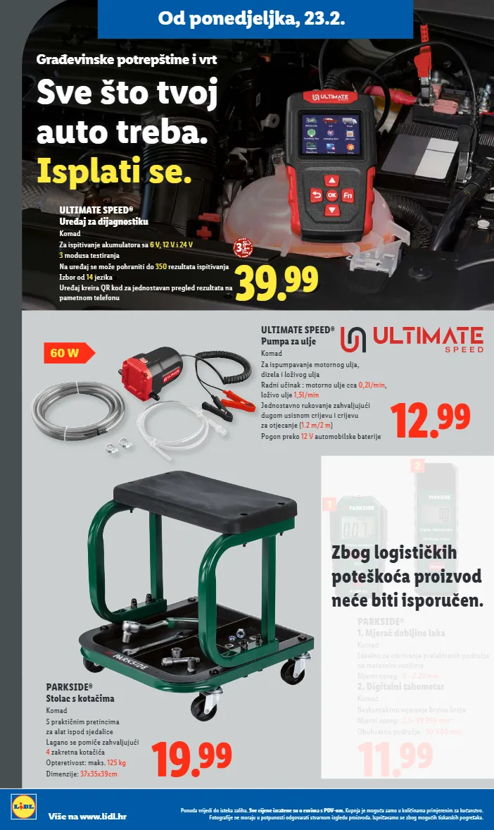 od ponedjeljka, 23.2. građevinske potrepštine i vrt sve što tvoj auto treba. isplati se. 39.99 ultimate speed ® uređaj za dijagnostiku komad za ispitivanje akumulatora sa 6 v, 12 v i 24 v 3 modusa testiranja na uređaj se može pohraniti do 350 rezultata ispitivanja izbor od 14 jezika uređaj kreira qr kod za jednostavan pregled rezultata na pametnom telefonu 12.99 ultimate speed ® pumpa za ulje komad za ispumpavanje motornog ulja, dizela i loživog ulja radni učinak : motorno ulje cca 0,2l/min , loživo ulje 1,5l/min jednostavno rukovanje zahvaljujući dugom usisnom crijevu i crijevu za otjecanje ( 1.2 m/2 m ) pogon preko 12 v automobilske baterije 60 w 19.99 parkside ® stolac s kotačima komad s praktičnim pretincima za alat ispod sjedalice lagano se pomiče zahvaljujući 4 zakretna kotačića opteretivost: maks. 125 kg dimenzije: 37x35x39cm 2 1 11.99 parkside ® 1. mjerač debljine laka komad idealno za otkrivanje prelakiranih područja na motornim vozilima mjerni opseg : 0 - 2,20 mm 2. digitalni tahometar komad beskontaktno mjerenje brzine broja mjerni opseg : 2,5- 99 999 min -1 obuhvatno područje : 50-500 mm zbog logističkih poteškoća proizvod neće biti isporučen. ponuda vrijedi do isteka zaliha. sve cijene izražene su u eurima s pdv-om. kupnja je moguća samo u količinama primjerenim za kućanstvo. fotografije ne moraju u potpunosti odgovarati stvarnom izgledu proizvoda. ispričavamo se zbog mogućih tiskarskih pogrešaka. više na www.lidl.hr