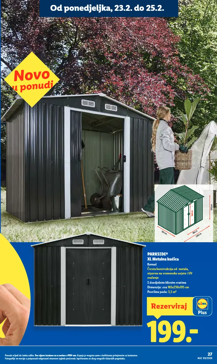 27 NAC 03/2026 Ponuda vrijedi do isteka zaliha. Sve cijene izražene su u eurima s PDV-om. Kupnja je moguća samo u količinama primjerenim za kućanstvo. Fotografije ne moraju u potpunosti odgovarati stvarnom izgledu proizvoda. Ispričavamo se zbog mogućih tiskarskih pogrešaka. Od ponedjeljka, 23.2. do 25.2. PARKSIDE ® XL Metalna kućica Komad Čvrsta konstrukcija od metala, otporna na vremenske uvjete i UV zračenje S dvodjelnim kliznim vratima Dimenzije: cca 165x230x195 cm Površina poda: 3,5 m² 199.- Rezerviraj Novo u ponudi 27 NAC 09/2026 Ponuda vrijedi do isteka zaliha. Sve cijene izražene su u eurima s PDV-om. Kupnja je moguća samo u količinama primjerenim za kućanstvo. Fotografije ne moraju u potpunosti odgovarati stvarnom izgledu proizvoda. Ispričavamo se zbog mogućih tiskarskih pogrešaka.