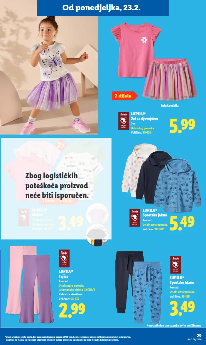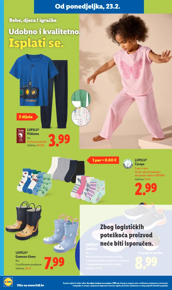 od ponedjeljka, 23.2. udobno i kvalitetno. isplati se. bebe, djeca i igračke 3.99 lupilu ® pidžama set od čistog pamuka veličine: 98-128 2 dijela 2.99 lupilu ® čarape 5 pari u setu visoki udio bio pamuka i elastansko vlakno (creora) veličine: 19-30 1 par = 0.60 € 7.99 lupilu ® gumene čizme par s profiliranim potplatom veličine: 24-31 lupilu ® tenisice par mesh-podstava za ugodno nošenje s čičak zatvaračem i elastičnim vezicama s tabanicom koja se može izvaditi veličine: 25-30 8.99 s treptajućim svjetlima zbog logističkih poteškoća proizvod neće biti isporučen. ponuda vrijedi do isteka zaliha. sve cijene izražene su u eurima s pdv-om. kupnja je moguća samo u količinama primjerenim za kućanstvo. fotografije ne moraju u potpunosti odgovarati stvarnom izgledu proizvoda. ispričavamo se zbog mogućih tiskarskih pogrešaka. više na www.lidl.hr
