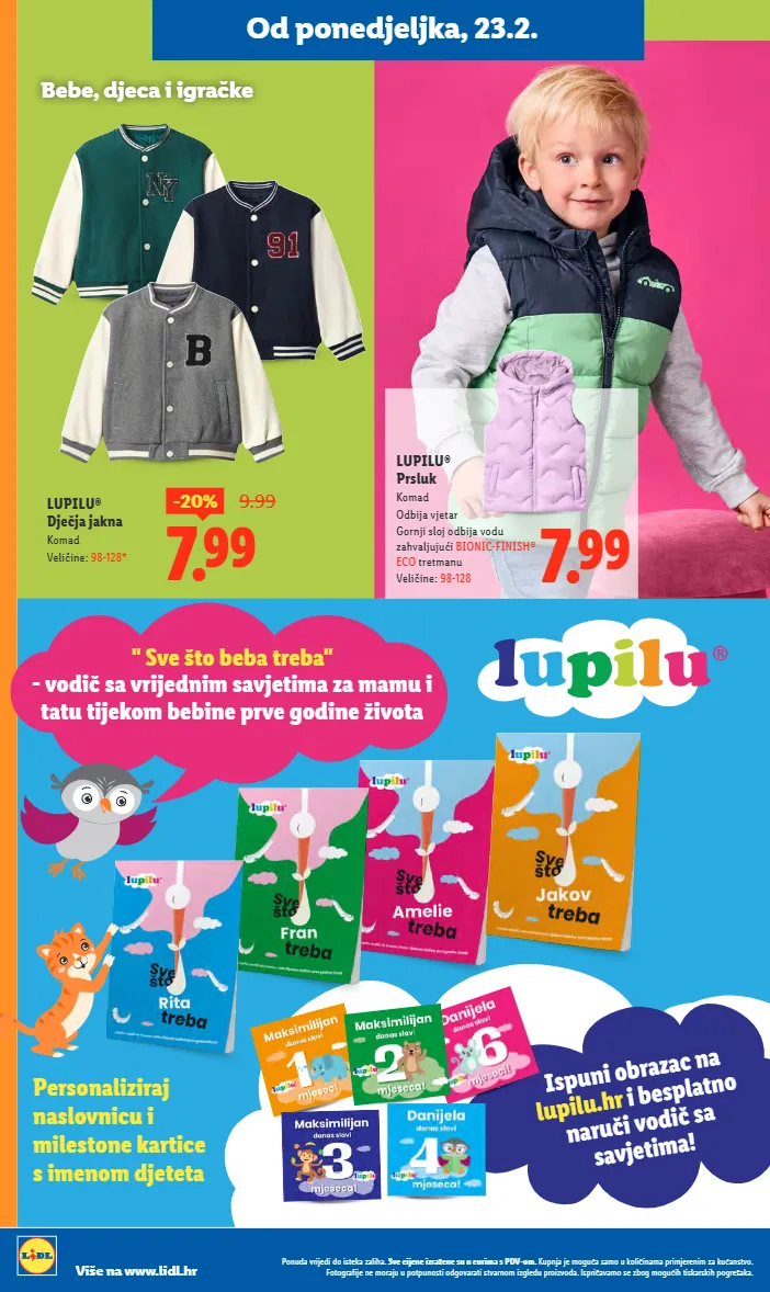 od ponedjeljka, 23.2. bebe, djeca i igračke 7.99 lupilu ® prsluk komad odbija vjetar gornji sloj odbija vodu zahvaljujući bionic-finish® eco tretmanu veličine: 98-128 ispuni obrazac na lupilu.hr i besplatno naruči vodič sa savjetima! personaliziraj naslovnicu i milestone kartice s imenom djeteta " sve što beba treba" - vodič sa vrijednim savjetima za mamu i tatu tijekom bebine prve godine života lupilu ® dječja jakna komad veličine: 98-128* 7. 99 -20% 9.99 ponuda vrijedi do isteka zaliha. sve cijene izražene su u eurima s pdv-om. kupnja je moguća samo u količinama primjerenim za kućanstvo. fotografije ne moraju u potpunosti odgovarati stvarnom izgledu proizvoda. ispričavamo se zbog mogućih tiskarskih pogrešaka. više na www.lidl.hr