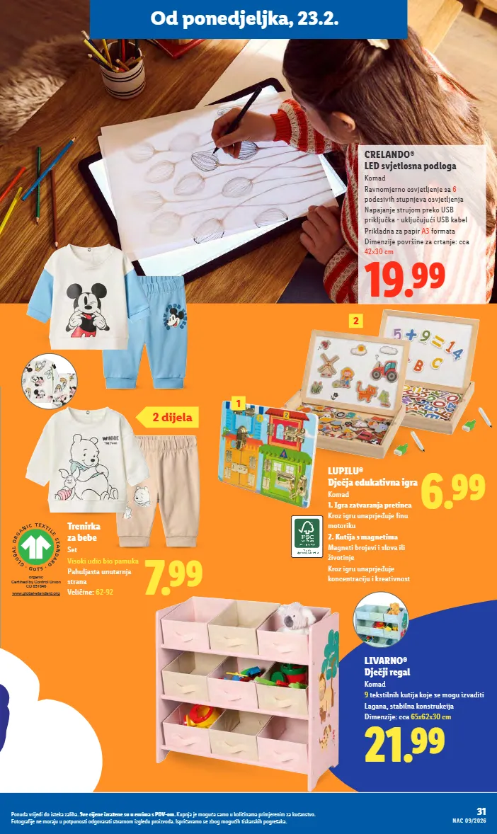 od ponedjeljka, 23.2. 21.99 livarno ® dječji regal komad 9 tekstilnih kutija koje se mogu izvaditi lagana, stabilna konstrukcija dimenzije: cca 65x62x30 cm 6.99 lupilu ® dječja edukativna igra komad 1. igra zatvaranja pretinca kroz igru unaprjeđuje finu motoriku 2. kutija s magnetima magneti brojevi i slova ili životinje kroz igru unaprjeđuje koncentraciju i kreativnost 2 1 19.99 crelando ® led svjetlosna podloga komad ravnomjerno osvjetljenje sa 6 podesivih stupnjeva osvjetljenja napajanje strujom preko usb priključka - uključujući usb kabel prikladna za papir a3 formata dimenzije površine za crtanje: cca 42x30 cm 7.99 trenirka za bebe set visoki udio bio pamuka pahuljasta unutarnja strana veličine: 62-92 organic certified by control union cu 851646 www.global-standard.org 2 dijela 31 nac 09/2026 ponuda vrijedi do isteka zaliha. sve cijene izražene su u eurima s pdv-om. kupnja je moguća samo u količinama primjerenim za kućanstvo. fotografije ne moraju u potpunosti odgovarati stvarnom izgledu proizvoda. ispričavamo se zbog mogućih tiskarskih pogrešaka.