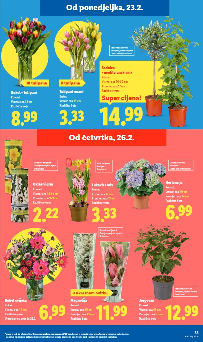 Od ponedjeljka, 23.2. Lidlova cvjećarnica. Isplati se. Ponuda vrijedi do isteka zaliha. Sve cijene izražene su u eurima s PDV-om. Kupnja je moguća samo u količinama primjerenim za kućanstvo. Fotografije ne moraju u potpunosti odgovarati stvarnom izgledu proizvoda. Ispričavamo se zbog mogućih tiskarskih pogrešaka. Više na www.lidl.hr Maćuhica Komad Visina: cca 22 cm Promjer: cca 12 cm Različite boje 2.22 Hortenzija Komad Visina: cca 25 cm Promjer: cca 9 cm Različite boje 4.99 Ficus Ginseng Komad Visina: cca 40 cm Promjer: cca 13 cm 9.99 Biljka penjačica/ puzavac Komad Visina: cca 33 cm Promjer: cca 9x9 cm Različite vrste 2.99 Proljetni mix Komad Visina: cca 30 cm Promjer: cca 14 cm Različite vrste 4.44 Redovito zalijevati Polusjena/svijetlo mjesto Držati vani Obilno zalijevati Polusjena Držati u kući/držati vani Redovito zalijevati Polusjena/svijetlo mjesto Držati vani 3 zumbula 2.99 Zumbuli rezani Buket Visina: cca 30 cm Različite boje Redovito zalijevati Polusjena/svijetlo mjesto Držati vani Redovito zalijevati Polusjena/svijetlo mjesto Držati u kući Anturij Komad Visina: cca 25-30 cm Promjer: cca 10 cm 6.99 Redovito zalijevati Polusjena/svijetlo mjesto Držati u kući 10 ruža Ruže rezane Buket Visina: cca 40 cm Različite boje 2.99 Ruže Ekskluziv rezane Buket Visina: cca 50 cm Različite boje 7.77 10 ruža u keramičkoj tegli