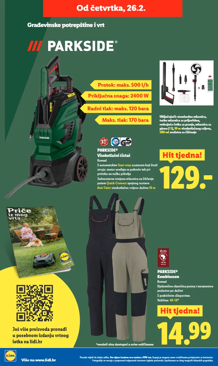 Od četvrtka, 26.2. Građevinske potrepštine i vrt 129.- H it tjedna ! PARKSIDE® Visokotlačni čistač Komad S automatskim Start-stop sustavom koji štedi struju: motor uređaja se pokreće tek pri pritisku na ručku pištolja Jednostavna izmjena mlaznica za čišćenje putem Quick-Connect spojnog sustava Anti-Twist visokotlačno crijevo dužine 10 m Priključna snaga: 2400 W Maks. tlak: 170 bara Radni tlak: maks. 120 bara Protok: maks. 500 l/h Uključujući: standardna mlaznica, turbo mlaznica za prljavštinu, rotirajuća četka za pranje, mlaznica za pjenu ( 1 l ), 10 m visokotlačnog crijeva, 500 ml sredstva za čišćenje 14.99 H it tjedna ! PARKSIDE® Kombinezon Komad Djelomično elastična pasica i naramenice podesive po dužini S praktičnim džepovima Veličine: 48-58* *modeli nisu dostupni u svim veličinama Još više proizvoda pronađi u posebnom izdanju vrtnog letka na lidl.hr Ponuda vrijedi do isteka zaliha. Sve cijene izražene su u eurima s PDV-om. Kupnja je moguća samo u količinama primjerenim za kućanstvo. Fotografije ne moraju u potpunosti odgovarati stvarnom izgledu proizvoda. Ispričavamo se zbog mogućih tiskarskih pogrešaka. Više na www.lidl.hr