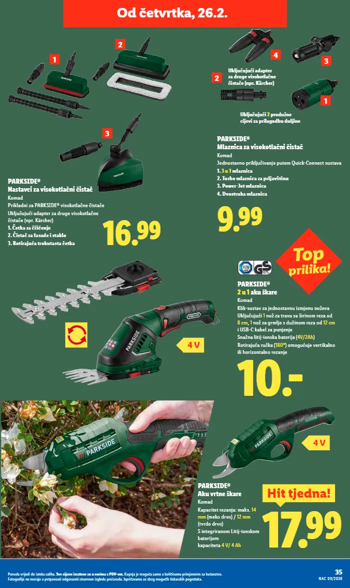 od četvrtka, 26.2. 9.99 parkside® mlaznica za visokotlačni čistač komad jednostavno priključivanje putem quick-connect sustava 1. 3 u 1 mlaznica 2. turbo mlaznica za prljavštinu 3. power-jet mlaznica 4. dvostruka mlaznica 2 3 4 2 uključujući adapter za druge visokotlačne čistače (npr. kärcher) uključujući 2 produžne cijevi za prilagodbu duljine 3 16.99 parkside® nastavci za visokotlačni čistač komad prikladni za parkside® visokotlačne čistače uključujući adapter za druge visokotlačne čistače (npr. kärcher) 1. četka za čišćenje 2. čistač za fasade i staklo 3. rotirajuća trokutasta četka 17.99 h it tjedna ! parkside® aku vrtne škare komad kapacitet rezanja: maks. 14 mm (meko drvo) / 12 mm (tvrdo drvo) s integriranom litij-ionskom baterijom kapaciteta 4 v/ 4 ah 1 parkside® 2 u 1 aku škare komad klik-sustav za jednostavnu izmjenu noževa uključujući 1 nož za travu sa širinom reza od 8 cm , 1 nož za grmlje s dužinom reza od 12 cm i usb-c kabel za punjenje snažna litij-ionska baterija ( 4v/2ah ) rotirajuća ručka ( 180° ) omogućuje vertikalno ili horizontalno rezanje 10 .- 4 v top prilika ! 4 v 1 35 nac 09/2026 ponuda vrijedi do isteka zaliha. sve cijene izražene su u eurima s pdv-om. kupnja je moguća samo u količinama primjerenim za kućanstvo. fotografije ne moraju u potpunosti odgovarati stvarnom izgledu proizvoda. ispričavamo se zbog mogućih tiskarskih pogrešaka.