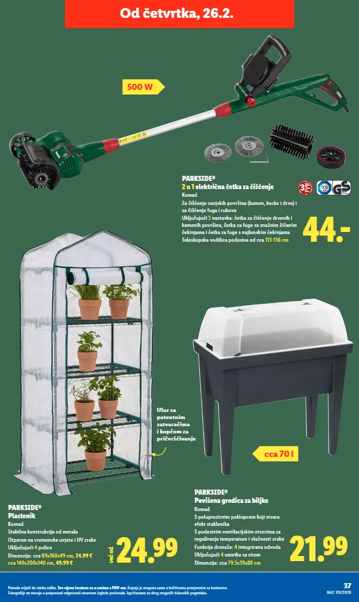PARKSIDE® Plastenik Komad Stabilna konstrukcija od metala Otporan na vremenske uvjete i UV zrake Uključujući 4 police Dimenzije: cca 69x160x49 cm, 24.99 € cca 140x200x140 cm, 49.99 € 24.99 već od Ulaz sa patentnim zatvaračima i kopčom za pričvršćivanje Od četvrtka, 26.2. 44.- PARKSIDE® 2 u 1 električna četka za čišćenje Komad Za čišćenje vanjskih površina (kamen, kocke i drvo) i za čišćenje fuga i rubova Uključujući 3 nastavka: četka za čišćenje drvenih i kamenih površina, četka za fuge sa snažnim žičanim čekinjama i četka za fuge s najlonskim čekinjama Teleskopska vodilica podesiva od cca 113-136 cm 500 W 21.99 PARKSIDE® Povišena gredica za biljke Komad S poluprozirnim poklopcem koji stvara efekt staklenika S podesivim ventilacijskim otvorima za reguliranje temperature i vlažnosti zraka Funkcija drenaže: 4 integrirana odvoda Uključujući 4 umetka sa sitom Dimenzije: cca 79.5x39x88 cm cca 70 l 37 NAC 09/2026 Ponuda vrijedi do isteka zaliha. Sve cijene izražene su u eurima s PDV-om. Kupnja je moguća samo u količinama primjerenim za kućanstvo. Fotografije ne moraju u potpunosti odgovarati stvarnom izgledu proizvoda. Ispričavamo se zbog mogućih tiskarskih pogrešaka.