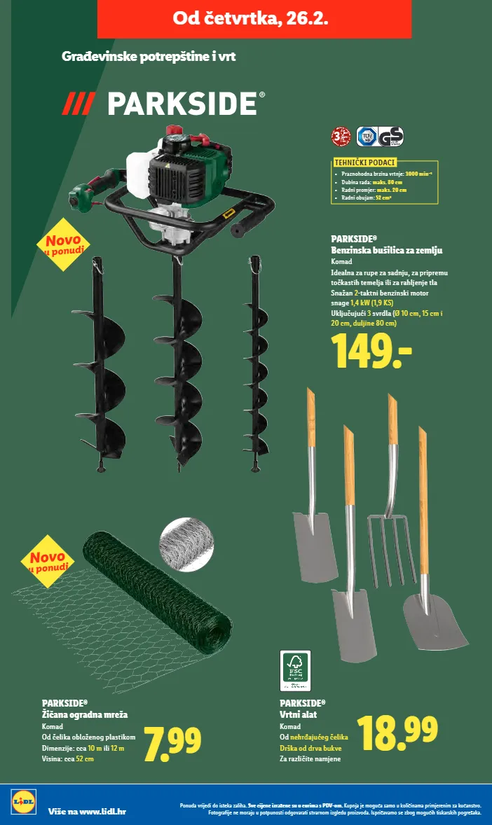 18.99 parkside® vrtni alat komad od nehrđajućeg čelika drška od drva bukve za različite namjene od četvrtka, 26.2. građevinske potrepštine i vrt tehnički podaci • praznohodna brzina vrtnje: 3000 min – 1 • dubina rada: maks. 80 cm • radni promjer: maks. 20 cm • radni obujam: 52 cm³ 149.- parkside® benzinska bušilica za zemlju komad idealna za rupe za sadnju, za pripremu točkastih temelja ili za rahljenje tla snažan 2 -taktni benzinski motor snage 1,4 kw (1,9 ks) uključujući 3 svrdla ( ø 10 cm, 15 cm i 20 cm, duljine 80 cm) novo u ponudi 7.99 parkside® žičana ogradna mreža komad od čelika obloženog plastikom dimenzije: cca 10 m ili 12 m visina: cca 52 cm novo u ponudi ponuda vrijedi do isteka zaliha. sve cijene izražene su u eurima s pdv-om. kupnja je moguća samo u količinama primjerenim za kućanstvo. fotografije ne moraju u potpunosti odgovarati stvarnom izgledu proizvoda. ispričavamo se zbog mogućih tiskarskih pogrešaka. više na www.lidl.hr