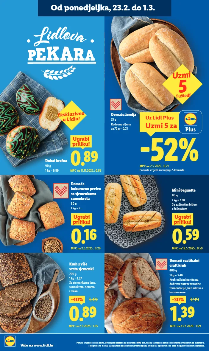 *rezultat se temelji na izjavljenom zadovoljstvu kupaca. yougov „fresh perception”. istraživanje provedeno u veljači 2025. na nacionalno reprezentativnom uzorku 1200 kućanstava na nivou cijele hrvatske. kupci ocjenjuju nespecijalizirane trgovce na malo pretežno hranom. pićima i duhanskim proizvodima. za pekarske proizvode* br. 1 0.89 ugrabi priliku! mpc na 17.11.2025.: 0.89 dubai krafna 90 g 1 kg = 9.89 0.59 ugrabi priliku! mpc na 2.5.2025.: 0.59 ekskluzivno u lidlu! mini baguette 80 g 1 kg = 7.38 sa začinskim biljem i češnjakom domaći rustikalni craft kruh 400 g 1 kg = 3.38 kruh od kiselog tijesta dobiven putem prirodne fermentacije, bez aditiva i konzervansa 1.35 -32% 1.99 mpc na 20.11.2025.: 1.99 kruh s više vrsta sjemenki 700 g 1 kg = 1.27 sa sjemenkama lana, suncokreta, sezama i maka 0.89 -40% 1.49 mpc na 2.5.2025.: 1.05 ponuda vrijedi do isteka zaliha. sve cijene izražene su u eurima s pdv-om. kupnja je moguća samo u količinama primjerenim za kućanstvo. fotografije ne moraju u potpunosti odgovarati stvarnom izgledu proizvoda. ispričavamo se zbog mogućih tiskarskih pogrešaka. više na www.lidl.hr do -52% na odabrane proizvode od ponedjeljka, 23.2. do 1.3. p roteinsko pecivo 110 g 1 kg = 4.09 redovna cijena za 1 kom = 0.69 2+1 gratis! 1.38 2+1 gratis! mpc na 2.5.2025.: 0.69 25% proteina ponuda vrijedi do isteka zaliha. sve cijene izražene su u eurima s pdv-om. kupnja je moguća samo u količinama primjerenim za kućanstvo. fotografije ne moraju u potpunosti odgovarati stvarnom izgledu proizvoda. ispričavamo se zbog mogućih tiskarskih pogrešaka. više na www.lidl.hr 0.89 ugrabi priliku! mpc na 17.11.2025.: 0.89 dubai krafna 90 g 1 kg = 9.89 0.59 ugrabi priliku! mpc na 19.5.2025.: 0.59 0.16 ugrabi priliku! mpc na 2.5.2025.: 0.29 ekskluzivno u lidlu! mini baguette 80 g 1 kg = 7.38 sa začinskim biljem i češnjakom domaći rustikalni craft kruh 400 g 1 kg = 3.48 kruh od kiselog tijesta dobiven putem prirodne fermentacije, bez aditiva i konzervansa 1.39 -30% 1.99 mpc na 23.2.2026.: 1.69 od ponedjeljka, 23.2. do 1.3. kruh s više vrsta sjemenki 700 g 1 kg = 1.27 sa sjemenkama lana, suncokreta, sezama i maka 0.89 -40% 1.49 mpc na 2.5.2025.: 1.05 ponuda vrijedi do isteka zaliha. sve cijene izražene su u eurima s pdv-om. kupnja je moguća samo u količinama primjerenim za kućanstvo. fotografije ne moraju u potpunosti odgovarati stvarnom izgledu proizvoda. ispričavamo se zbog mogućih tiskarskih pogrešaka. više na www.lidl.hr uzmi 5 i uštedi domaće kukuruzno pecivo sa sjemenkama suncokreta 80 g 1 kg = 2.- uz lidl plus uzmi 5 za -52% mpc na 2.5.2025.: 0.21 ponuda vrijedi za kupnju 5 komada domaća žemlja 75 g redovna cijena za 75 g = 0.21