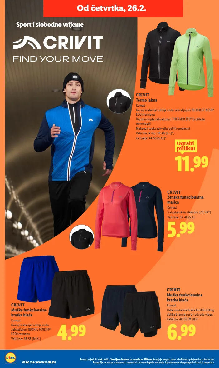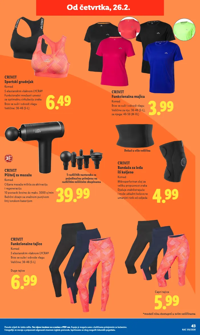 *modeli nisu dostupni u svim veličinama od četvrtka, 26.2. 6.49 crivit sportski grudnjak komad s elastanskim vlaknom lycra ® funkcionalni mrežasti umetci za optimalnu cirkulaciju zraka brzo se suši i odvodi vlagu veličine: 36-46 (s-l) 3.99 crivit funkcionalna majica komad brzo se suši i odvodi vlagu veličine za nju: 36-46 (s-l), za njega: 48-58 (m-xl) 5 različitih nastavaka za pojedinačnu primjenu na različitim mišićnim skupinama 39.99 crivit pištolj za masažu komad ciljana masaža mišića za aktivaciju i regeneraciju 10 postavki brzine do maks. 3000 o/min bežični dizajn sa snažnom punjivom litij ionskom baterijom crivit funkcionalne tajice komad s elastanskim vlaknom lycra ® brzo se suše i odvode vlagu veličine: 36-46 (s-l) duge tajice capri tajice 5.99 6.99 4.99 crivit bandaža za leđa ili koljeno komad mikroperforiran sloj za veliku propusnost zraka djeluje stabilizirajuće i može ublažiti bolove te umanjiti rizik od ozljeda dolazi u više veličina 43 nac 09/2026 ponuda vrijedi do isteka zaliha. sve cijene izražene su u eurima s pdv-om. kupnja je moguća samo u količinama primjerenim za kućanstvo. fotografije ne moraju u potpunosti odgovarati stvarnom izgledu proizvoda. ispričavamo se zbog mogućih tiskarskih pogrešaka.