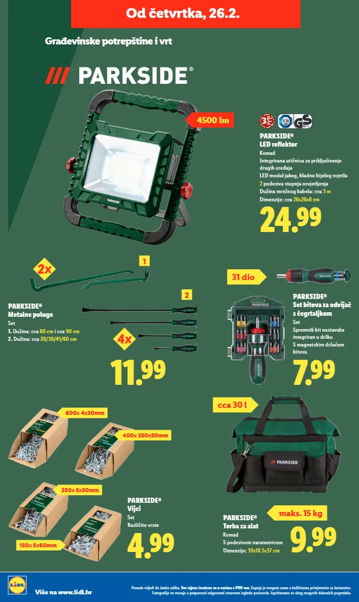 2x 4x od četvrtka, 26.2. građevinske potrepštine i vrt 24.99 parkside ® led reflektor komad integrirana utičnica za priključivanje drugih uređaja led modul jakog, hladno bijelog svjetla 2 podesiva stupnja osvjetljenja dužina mrežnog kabela: cca 3 m dimenzije: cca 26x26x8 cm 11.99 parkside ® metalne poluge set 1. dužina: cca 60 cm i cca 90 cm 2. dužina: cca 20/30/45/60 cm 1 2 600x 4x30mm 250x 5x50mm 400x 250x50mm 150x 5x60mm 7.99 parkside ® set bitova za odvijač s čegrtaljkom set spremnik bit nastavaka integriran u dršku s magnetskim držačem bitova 31 dio 4.99 parkside ® vijci set različite vrste 9.99 parkside ® torba za alat komad s podesivom naramenicom dimenzije: 39x18.5x37 cm cca 30 l maks. 15 kg 4500 lm ponuda vrijedi do isteka zaliha. sve cijene izražene su u eurima s pdv-om. kupnja je moguća samo u količinama primjerenim za kućanstvo. fotografije ne moraju u potpunosti odgovarati stvarnom izgledu proizvoda. ispričavamo se zbog mogućih tiskarskih pogrešaka. više na www.lidl.hr