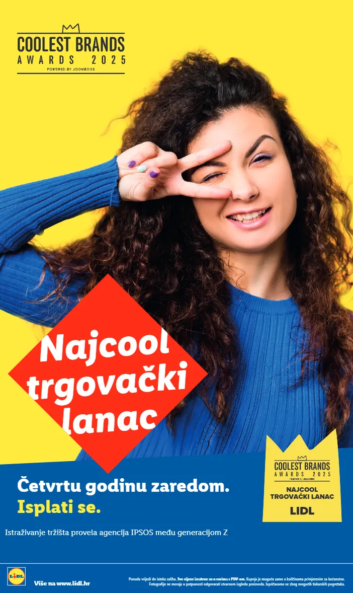 *Rezultat se temelji na izjavljenom zadovoljstvu kupaca. YouGov „Fresh Perception”, istraživanje provedeno u veljači 2025. na nacionalno reprezentativnom uzorku 1200 kućanstava na nivou cijele Hrvatske. Kupci ocjenjuju nespecijalizirane trgovce na malo pretežno hranom, pićima i duhanskim proizvodima. Najcool trgovački lanac Četvrtu godinu zaredom. Isplati se. NAJCOOL TRGOVAČKI LANAC Istraživanje tržišta provela agencija IPSOS među generacijom Z Ponuda vrijedi do isteka zaliha. Sve cijene izražene su u eurima s PDV-om. Kupnja je moguća samo u količinama primjerenim za kućanstvo. Fotografije ne moraju u potpunosti odgovarati stvarnom izgledu proizvoda. Ispričavamo se zbog mogućih tiskarskih pogrešaka. Više na www.lidl.hr