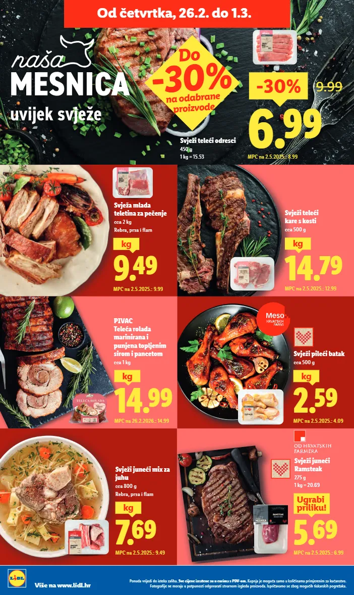14.99 kg mpc na 26.2.2026.: 14.99 pivac teleća rolada marinirana i punjena topljenim sirom i pancetom cca 1 kg 9.49 kg mpc na 2.5.2025.: 9.99 5.69 ugrabi priliku! mpc na 2.5.2025.: 6.99 svježi juneći ramsteak 275 g 1 kg = 20.69 ponuda vrijedi do isteka zaliha. sve cijene izražene su u eurima s pdv-om. kupnja je moguća samo u količinama primjerenim za kućanstvo. fotografije ne moraju u potpunosti odgovarati stvarnom izgledu proizvoda. ispričavamo se zbog mogućih tiskarskih pogrešaka. više na www.lidl.hr 7.69 kg mpc na 2.5.2025.: 9.49 svježi juneći mix za juhu cca 800 g rebra, prsa i flam svježa mlada teletina za pečenje cca 2 kg rebra, prsa i flam svježi teleći kare s kosti cca 500 g 14.79 kg mpc na 2.5.2025.: 12.99 svježi pileći batak cca 500 g 6.99 9.99 mpc na 2.5.2025.: 8.99 -30% do -30% na odabrane proizvode svježi teleći odresci 450 g 1 kg = 15.53 2.59 kg mpc na 2.5.2025.: 4.09 od četvrtka, 26.2. do 1.3.