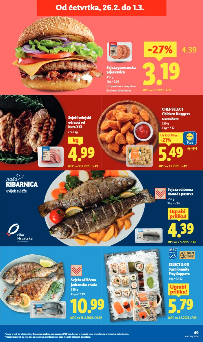4.39 ugrabi priliku! mpc na 2.5.2025.: 5.69 5.79 ugrabi priliku! mpc na 2.5.2025.: 7.99 4.99 kg mpc na 30.1.2026.: 5.49 svježi svinjski odresci od buta xxl cca 1 kg select & go sushi family tray sapporo 1 kg = 12.52 svježa očišćena domaća pastrva 550 g 1 kg = 7.98 49 nac 09/2026 ponuda vrijedi do isteka zaliha. sve cijene izražene su u eurima s pdv-om. kupnja je moguća samo u količinama primjerenim za kućanstvo. prikazani proizvodi su prijedlog za serviranje. ispričavamo se zbog mogućih tiskarskih pogrešaka. 3.19 4.39 mpc na 2.5.2025.: 4.39 -27% 6.99 5.49 -21% uz lidl plus mpc na 1.8.2025.: 5.49 chef select chicken nuggets s umakom 750 g 1 kg = 7.32 svježa gurmanska pljeskavica 450 g 1 kg = 7.09 od junetine i svinjetine sa sirom i slaninom od četvrtka, 26.2. do 1.3. svježa očišćena jadranska orada 880 g 1 kg = 12.49 10.99 mpc na 26.2.2026.: 10.99