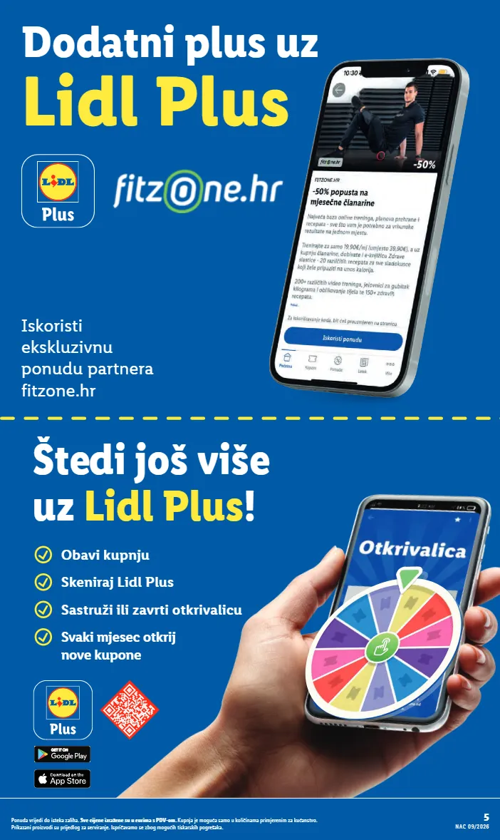 Dodatni plus uz Lidl Plus Iskoristi ekskluzivnu ponudu partnera Kokolingo U dolasku Štedi još više uz Lidl Plus ! Obavi kupnju Skeniraj Lidl Plus Sastruži ili zavrti otkrivalicu Svaki mjesec otkrij nove kupone 5 Ponuda vrijedi do isteka zaliha. Sve cijene izražene su u eurima s PDV-om. Kupnja je moguća samo u količinama primjerenim za kućanstvo. Prikazani proizvodi su prijedlog za serviranje. Ispričavamo se zbog mogućih tiskarskih pogrešaka. 5 Ponuda vrijedi do isteka zaliha. Sve cijene izražene su u eurima s PDV-om. Kupnja je moguća samo u količinama primjerenim za kućanstvo. Fotografije ne moraju u potpunosti odgovarati stvarnom izgledu proizvoda. Ispričavamo se zbog mogućih tiskarskih pogrešaka. NAC 09/2026 Dodatni plus uz Lidl Plus Iskoristi ekskluzivnu ponudu partnera fitzone.hr Štedi još više uz Lidl Plus ! Obavi kupnju Skeniraj Lidl Plus Sastruži ili zavrti otkrivalicu Svaki mjesec otkrij nove kupone 5 NAC 09/2026 Ponuda vrijedi do isteka zaliha. Sve cijene izražene su u eurima s PDV-om. Kupnja je moguća samo u količinama primjerenim za kućanstvo. Prikazani proizvodi su prijedlog za serviranje. Ispričavamo se zbog mogućih tiskarskih pogrešaka.