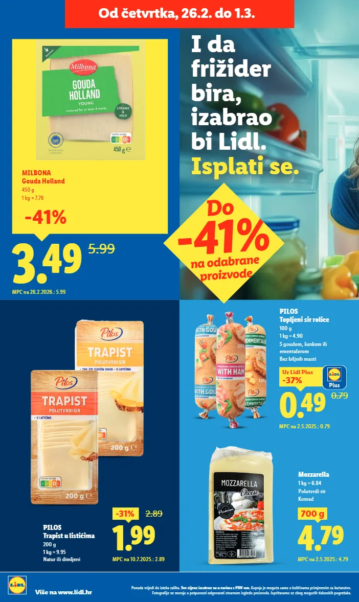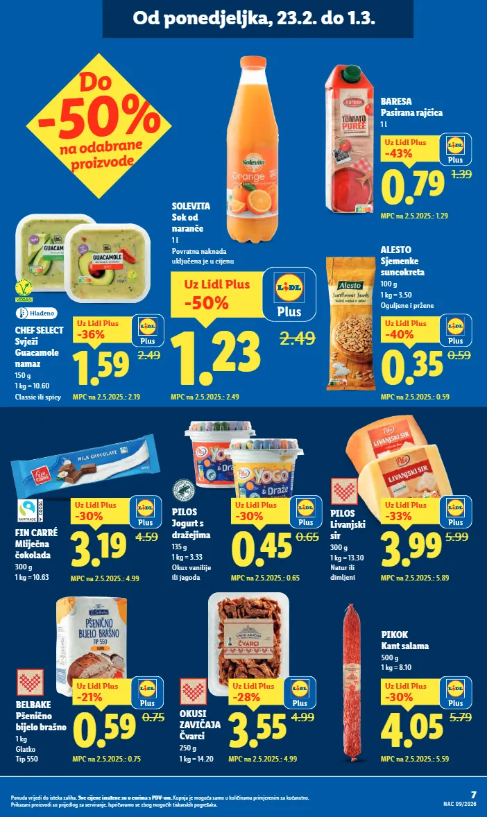 od ponedjeljka, 23.2. do 1.3. 7 nac 09/2026 ponuda vrijedi do isteka zaliha. sve cijene izražene su u eurima s pdv-om. kupnja je moguća samo u količinama primjerenim za kućanstvo. prikazani proizvodi su prijedlog za serviranje. ispričavamo se zbog mogućih tiskarskih pogrešaka. 5.79 4.05 -30% uz lidl plus mpc na 2.5.2025.: 5.59 fin carré mliječna čokolada 300 g 1 kg = 10.63 pikok kant salama 500 g 1 kg = 8.10 pilos livanjski sir 300 g 1 kg = 13.30 natur ili dimljeni belbake pšenično bijelo brašno 1 kg glatko tip 550 2.49 1.59 -36% uz lidl plus mpc na 2.5.2025.: 2.19 chef select svježi guacamole namaz 150 g 1 kg = 10.60 classic ili spicy 1.39 0.79 -43% uz lidl plus mpc na 2.5.2025.: 1.29 baresa pasirana rajčica 1 l 0.59 0.35 -40% uz lidl plus mpc na 2.5.2025.: 0.59 alesto s jemenke suncokreta 100 g 1 kg = 3.50 oguljene i pržene 5.99 3.99 -33% uz lidl plus mpc na 2.5.2025.: 5.89 0.65 0.45 -30% uz lidl plus mpc na 2.5.2025.: 0.65 pilos jogurt s dražejima 135 g 1 kg = 3.33 okus vanilije ili jagoda 4.59 3.19 -30% uz lidl plus mpc na 2.5.2025.: 4.99 201024 okusi zavičaja čvarci 250 g 1 kg = 14.20 0.75 0.59 -21% uz lidl plus mpc na 2.5.2025.: 0.75 4.99 3.55 -28% uz lidl plus mpc na 2.5.2025.: 4.99 do -50% na odabrane proizvode uz lidl plus -50% 1.23 2.49 mpc na 2.5.2025.: 2.49 solevita s ok od naranče 1 l povratna naknada uključena je u cijenu