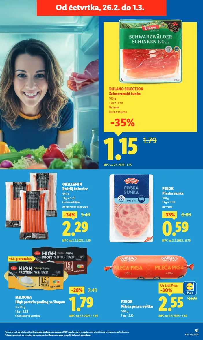 1.15 1.79 dulano selection schwarzwald šunka 100 g 1 kg = 11.50 narezak ručno soljena mpc na 2.5.2025.: 1.85 -35% od četvrtka, 26.2. do 1.3. 0.59 -33% 0.89 mpc na 2.5.2025.: 0.79 pikok pivska šunka 100 g 1 kg = 5.90 narezak 2.29 -34% 3.49 mpc na 2.5.2025.: 3.49 grill&fun roštilj kobasice 440 g 1 kg = 5.20 ljuta roštiljka, debrecinka ili pivska pikok pileća prsa u ovitku 500 g 1 kg = 5.10 1.79 -28% 2.49 mpc na 2.5.2025.: 2.49 milbona high protein puding sa šlagom 4 x 115 g 1 kg = 3.89 čokolada ili vanilija 11.5 g proteina 3.69 2.55 -30% uz lidl plus mpc na 2.5.2025.: 3.69 51 nac 09/2026 ponuda vrijedi do isteka zaliha. sve cijene izražene su u eurima s pdv-om. kupnja je moguća samo u količinama primjerenim za kućanstvo. prikazani proizvodi su prijedlog za serviranje. ispričavamo se zbog mogućih tiskarskih pogrešaka.