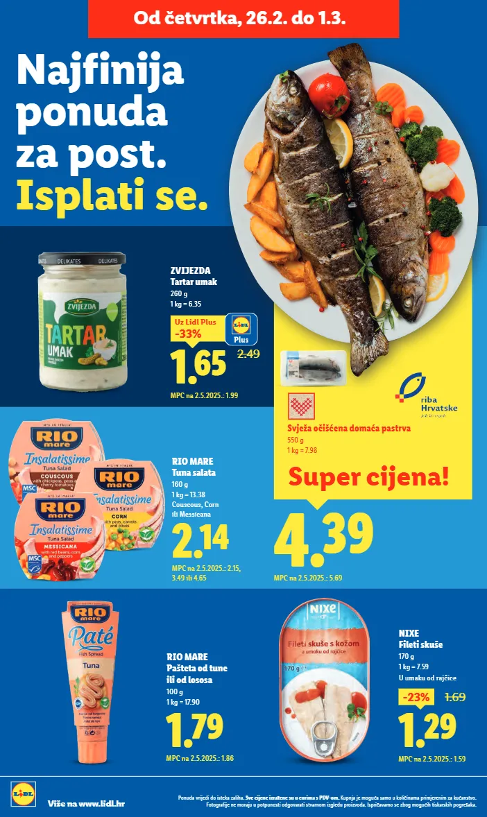 najfinija ponuda za post. isplati se. ponuda vrijedi do isteka zaliha. sve cijene izražene su u eurima s pdv-om. kupnja je moguća samo u količinama primjerenim za kućanstvo. fotografije ne moraju u potpunosti odgovarati stvarnom izgledu proizvoda. ispričavamo se zbog mogućih tiskarskih pogrešaka. više na www.lidl.hr od četvrtka, 26.2. do 1.3. 1.29 -23% 1.69 mpc na 2.5.2025.: 1.59 nixe fileti skuše 170 g 1 kg = 7.59 u umaku od rajčice 2.14 mpc na 2.5.2025.: 2.15, 3.49 ili 4.65 rio mare tuna salata 160 g 1 kg = 13.38 couscous, corn ili messicana zvijezda tartar umak 260 g 1 kg = 6.35 rio mare pašteta od tune ili od lososa 100 g 1 kg = 17.90 1.79 mpc na 2.5.2025.: 1.86 2.49 1.65 -33% uz lidl plus mpc na 2.5.2025.: 1.99 4.39 mpc na 2.5.2025.: 5.69 super cijena! svježa očišćena domaća pastrva 550 g 1 kg = 7.98