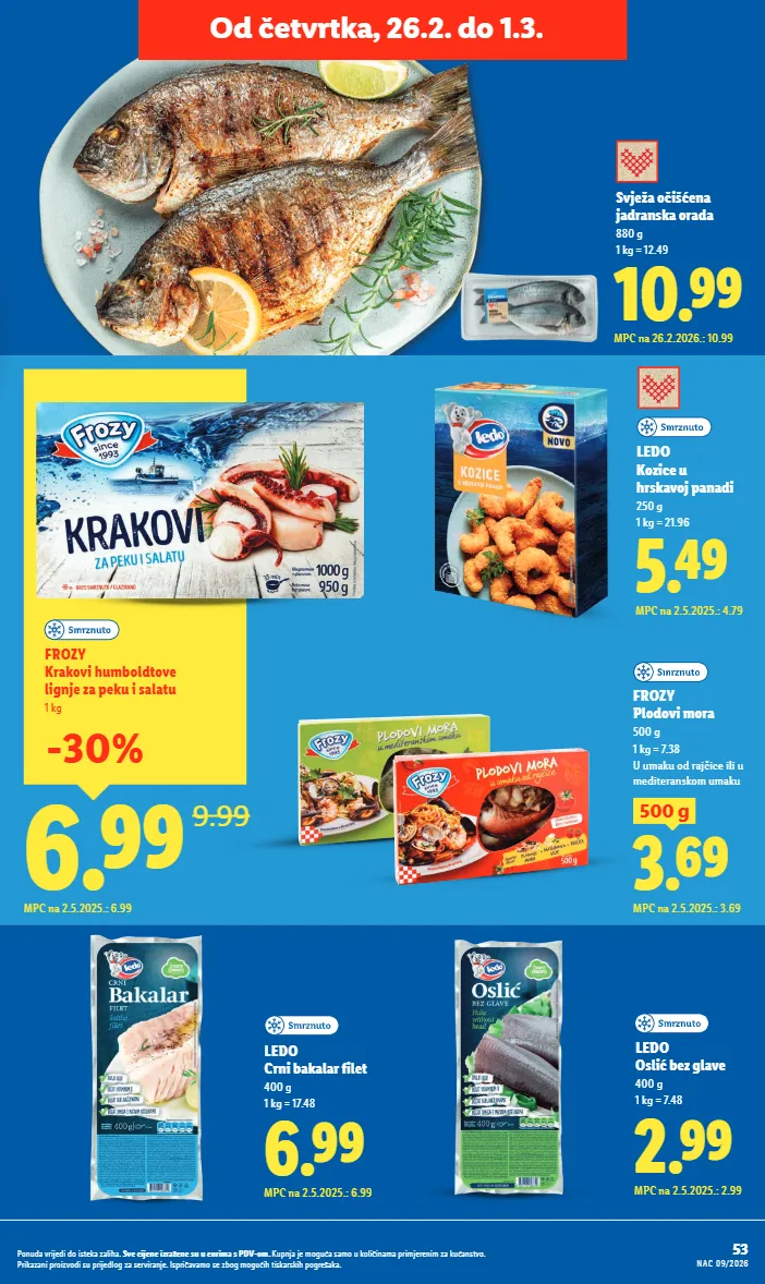53 nac 09/2026 ponuda vrijedi do isteka zaliha. sve cijene izražene su u eurima s pdv-om. kupnja je moguća samo u količinama primjerenim za kućanstvo. prikazani proizvodi su prijedlog za serviranje. ispričavamo se zbog mogućih tiskarskih pogrešaka. od četvrtka, 26.2. do 1.3. frozy plodovi mora 500 g 1 kg = 7.38 u umaku od rajčice ili u mediteranskom umaku 2.99 mpc na 2.5.2025.: 2.99 ledo oslić bez glave 400 g 1 kg = 7.48 5.49 mpc na 2.5.2025.: 4.79 ledo kozice u hrskavoj panadi 250 g 1 kg = 21.96 6.99 mpc na 2.5.2025.: 6.99 ledo crni bakalar filet 400 g 1 kg = 17.48 svježa očišćena jadranska orada 880 g 1 kg = 12.49 10.99 mpc na 26.2.2026.: 10.99 3.69 500 g mpc na 2.5.2025.: 3.69 6.99 9.99 frozy krakovi humboldtove lignje za peku i salatu 1 kg mpc na 2.5.2025.: 6.99 -30%
