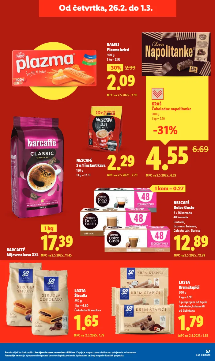od četvrtka, 26.2. do 1.3. 55 nac 09/2026 ponuda vrijedi do isteka zaliha. sve cijene izražene su u eurima s pdv-om. kupnja je moguća samo u količinama primjerenim za kućanstvo. prikazani proizvodi su prijedlog za serviranje. ispričavamo se zbog mogućih tiskarskih pogrešaka. tastino sandwich toast 375 g 1 kg = 1.84 uz lidl plus -42% 0.69 1.19 mpc na 2.5.2025.: 0.99 3.29 2.19 -33% uz lidl plus mpc na 2.5.2025.: 2.79 stolno bijelo vino 2 l 1 l = 1.10 alk. 10.5% vol. povratna naknada uključena je u cijenu 2.59 1.79 -30% uz lidl plus mpc na 2.5.2025.: 2.59 tastino čajni kolutići 700 g ili 800 g 1 kg = 2.56 ili 2.24 classic ili kakao 2.79 1.99 -28% uz lidl plus mpc na 2.5.2025.: 2.79 chef select svježe lasagne 400 g 1 kg = 4.98 govedina, svinjetina ili 4 sira 2.42 1.99 -17% uz lidl plus mpc na 2.5.2025.: 2.42 'z bregov svježe mlijeko 1.75 l 1 l = 1.14 golden sun basmati riža 1 kg 2.95 2.15 -27% uz lidl plus mpc na 2.5.2025.: 2.29 0.89 0.65 -26% uz lidl plus mpc na 16.9.2025.: 0.89 baroni pašteta 130 g 1 kg = 5.- čajna ili jetrena