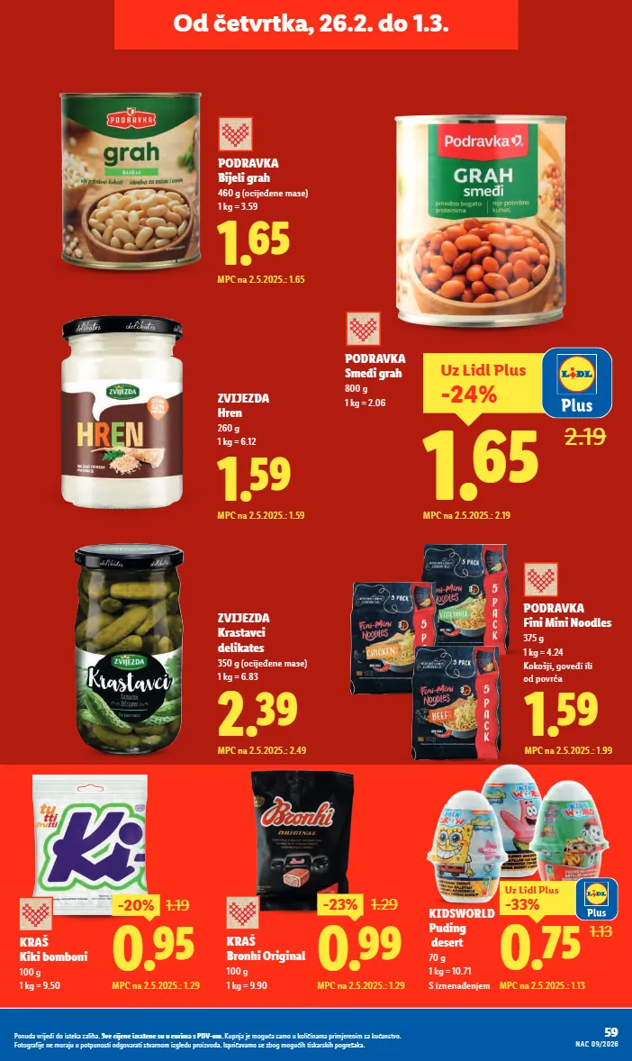 1.59 mpc na 2.5.2025.: 1.59 zvijezda hren 260 g 1 kg = 6.12 podravka bijeli grah 460 g (ocijeđene mase) 1 kg = 3.59 1.65 mpc na 2.5.2025.: 1.65 2.39 mpc na 2.5.2025.: 2.49 zvijezda krastavci delikates 350 g (ocijeđene mase) 1 kg = 6.83 1.59 mpc na 2.5.2025.: 1.99 podravka fini mini noodles 375 g 1 kg = 4.24 kokošji, goveđi ili od povrća 59 nac 07/2026 ponuda vrijedi do isteka zaliha. sve cijene izražene su u eurima s pdv-om. kupnja je moguća samo u količinama primjerenim za kućanstvo. fotografije ne moraju u potpunosti odgovarati stvarnom izgledu proizvoda. ispričavamo se zbog mogućih tiskarskih pogrešaka. od četvrtka, 26.2. do 1.3. 59 nac 09/2026 ponuda vrijedi do isteka zaliha. sve cijene izražene su u eurima s pdv-om. kupnja je moguća samo u količinama primjerenim za kućanstvo. fotografije ne moraju u potpunosti odgovarati stvarnom izgledu proizvoda. ispričavamo se zbog mogućih tiskarskih pogrešaka. kraš kiki bomboni 100 g 1 kg = 9.50 0.95 -20% 1.19 mpc na 2.5.2025.: 1.29 1.13 0.75 -33% uz lidl plus mpc na 2.5.2025.: 1.13 kidsworld puding desert 70 g 1 kg = 10.71 s iznenađenjem uz lidl plus -24% 1.65 2.19 mpc na 2.5.2025.: 2.19 podravka smeđi grah 800 g 1 kg = 2.06 kraš bronhi original 100 g 1 kg = 9.90 0.99 -23% 1.29 mpc na 2.5.2025.: 1.29