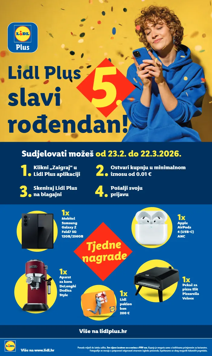 Tjedne nagrade Više na lidlplus.hr Mobitel Samsung Galaxy Z Fold7 5G 12GB/256GB 1x Aparat za kavu DeLonghi Dedica Style 1x Pekač za pizzu Elit Pizzarella Veloce 1x Lidl poklon bon 200 € 1x Apple AirPods 4 (USB-C) ANC 1x Ponuda vrijedi do isteka zaliha. Sve cijene izražene su u eurima s PDV-om. Kupnja je moguća samo u količinama primjerenim za kućanstvo. Fotografije ne moraju u potpunosti odgovarati stvarnom izgledu proizvoda. Ispričavamo se zbog mogućih tiskarskih pogrešaka. Više na www.lidl.hr Lidl Plus slavi rođendan! 5 . Sudjelovati možeš od 23.2. do 22.3.2026. 1. Klikni „Zaigraj“ u Lidl Plus aplikaciji 2. Ostvari kupnju u minimalnom iznosu od 0.01 € 3. Skeniraj Lidl Plus na blagajni 4. Pošalji svoju prijavu