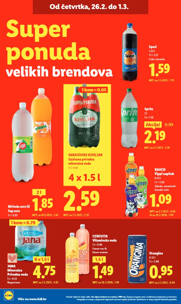 mirinda zero ili 7up zero 1 l = 0.93 1.09 mpc na 2.5.2025.: 0.66 ili na 26.2.2026.: 1.09 rauch yippi napitak 0.33 l 1 l = 3.30 jabuka, naranča ili šumsko voće 1.59 mpc na 2.5.2025.: 1.79 spezi 1.25 l 1 l = 1.27 cola i naranča 0.95 mpc na 2.5.2025.: 0.99 sprite 2 l 1 l = 1.10 jana mineralna prirodna voda 1 l = 0.53 negazirana orangina 0.33 l 1 l = 2.88 ponuda vrijedi do isteka zaliha. sve cijene izražene su u eurima s pdv-om. kupnja je moguća samo u količinama primjerenim za kućanstvo. fotografije ne moraju u potpunosti odgovarati stvarnom izgledu proizvoda. ispričavamo se zbog mogućih tiskarskih pogrešaka. više na www.lidl.hr ponuda vrijedi do isteka zaliha. sve cijene izražene su u eurima s pdv-om. kupnja je moguća samo u količinama primjerenim za kućanstvo. fotografije ne moraju u potpunosti odgovarati stvarnom izgledu proizvoda. ispričavamo se zbog mogućih tiskarskih pogrešaka. više na www.lidl.hr 1.85 2 l mpc na 18.9.2025.: 1.85 1.49 1.5 l mpc na 26.2.2026.: 1.49 2.19 akcija! 2.39 mpc na 2.5.2025.: 2.28 1 kom = 0.79 cedevita vitaminska voda 1 l = 0.99 limun-nar ili limun-ananas 4.75 6 x 1.5 l mpc na 2.5.2025.: 4.85 super ponuda velikih brendova 2.59 mpc na 2.5.2025.: 2.59 4 x 1.5 l sarajevski kiseljak gazirana prirodna mineralna voda 1 l = 0.43 1 kom = 0.65 od četvrtka, 26.2. do 1.3.