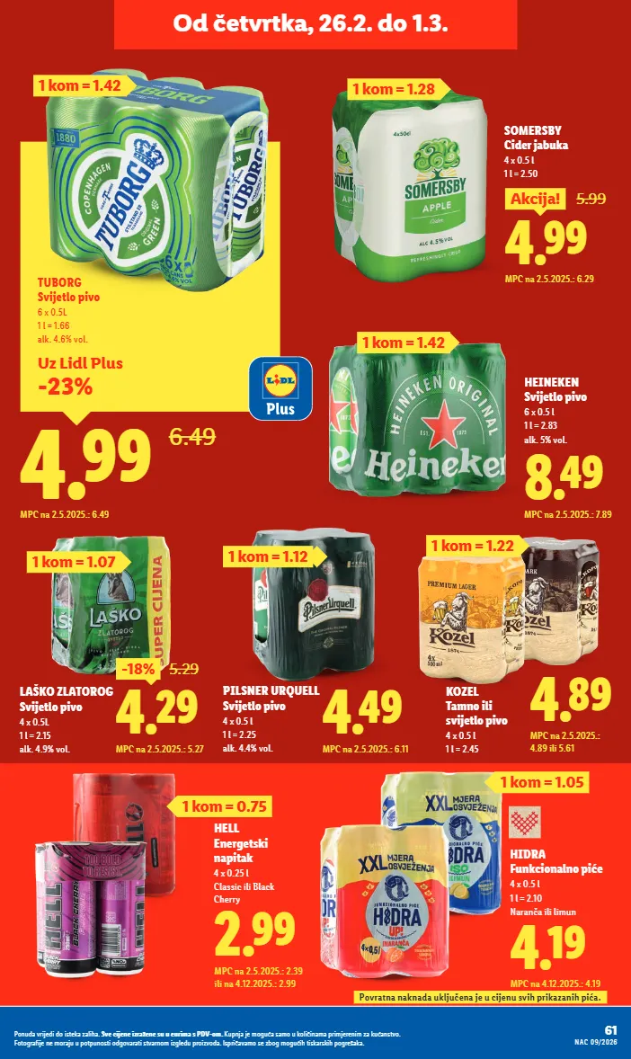 2.99 mpc na 2.5.2025.: 2.39 ili na 4.12.2025.: 2.99 hell energetski napitak 4 x 0.25 l classic ili black cherry 4.19 mpc na 4.12.2025.: 4.19 hidra funkcionalno piće 4 x 0.5 l 1 l = 2.10 naranča ili limun 1 kom = 1.05 somersby cider jabuka 4 x 0.5 l 1 l = 2.50 4.49 mpc na 2.5.2025.: 6.11 pilsner urquell svijetlo pivo 4 x 0.5 l 1 l = 2.25 alk. 4.4% vol. laško zlatorog svijetlo pivo 4 x 0.5l 1 l = 2.15 alk. 4.9% vol. 1 kom = 0.75 8.49 mpc na 2.5.2025.: 7.89 heineken svijetlo pivo 6 x 0.5 l 1 l = 2.83 alk. 5% vol. 1 kom = 1.42 1 kom = 1.12 61 nac 07/2026 ponuda vrijedi do isteka zaliha. sve cijene izražene su u eurima s pdv-om. kupnja je moguća samo u količinama primjerenim za kućanstvo. fotografije ne moraju u potpunosti odgovarati stvarnom izgledu proizvoda. ispričavamo se zbog mogućih tiskarskih pogrešaka. od četvrtka, 26.2. do 1.3. 61 nac 09/2026 ponuda vrijedi do isteka zaliha. sve cijene izražene su u eurima s pdv-om. kupnja je moguća samo u količinama primjerenim za kućanstvo. fotografije ne moraju u potpunosti odgovarati stvarnom izgledu proizvoda. ispričavamo se zbog mogućih tiskarskih pogrešaka. 4.29 -18% 5.29 mpc na 2.5.2025.: 5.27 1 kom = 1.07 1 kom = 1.28 uz lidl plus -23% 4.99 6.49 tuborg svijetlo pivo 6 x 0.5l 1 l = 1.66 alk. 4.6% vol. mpc na 2.5.2025.: 6.49 4.99 akcija! 5.99 mpc na 2.5.2025.: 6.29 povratna naknada uključena je u cijenu svih prikazanih pića. 1 kom = 1.42 1 kom = 1.22 4.89 mpc na 2.5.2025.: 4.89 ili 5.61 kozel tamno ili svijetlo pivo 4 x 0.5 l 1 l = 2.45