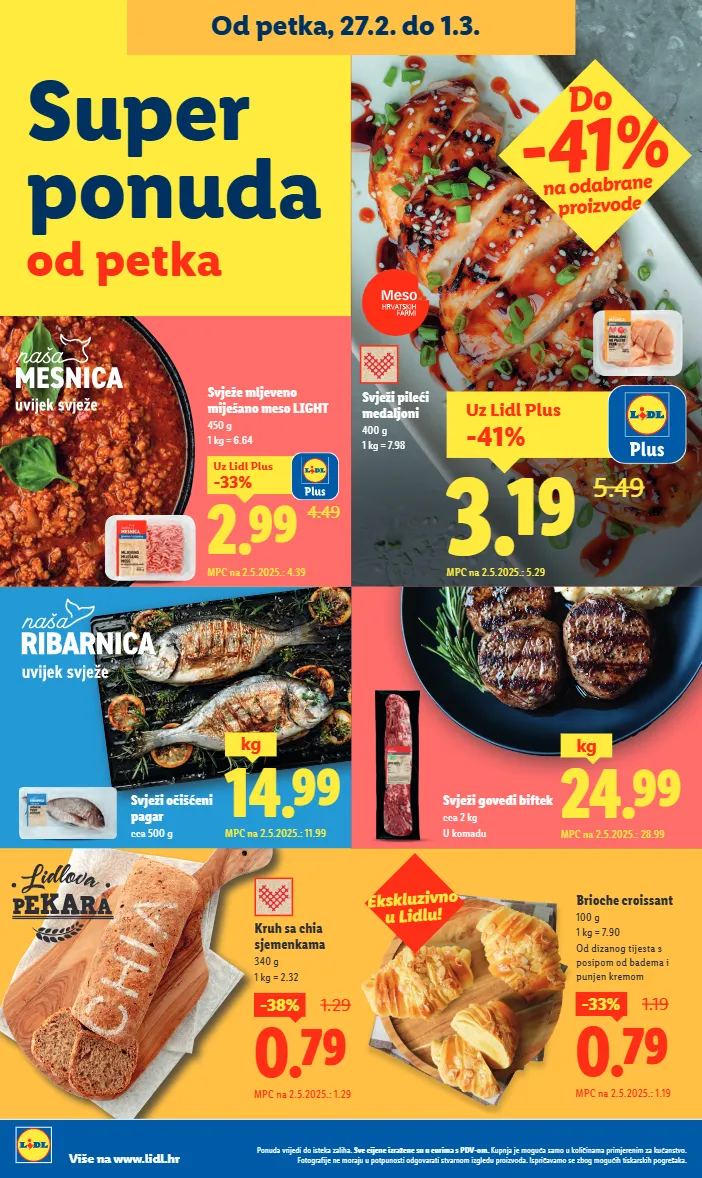 od petka, 27.2. do 1.3. super ponuda od petka ponuda vrijedi do isteka zaliha. sve cijene izražene su u eurima s pdv-om. kupnja je moguća samo u količinama primjerenim za kućanstvo. fotografije ne moraju u potpunosti odgovarati stvarnom izgledu proizvoda. ispričavamo se zbog mogućih tiskarskih pogrešaka. više na www.lidl.hr 14.99 kg mpc na 2.5.2025.: 11.99 svježi očišćeni pagar cca 500 g svježi pileći medaljoni 400 g 1 kg = 7.98 uz lidl plus -41% 3.19 5.49 mpc na 2.5.2025.: 5.29 svježi goveđi biftek cca 2 kg u komadu 24.99 kg mpc na 2.5.2025.: 28.99 0.79 -38% 1.29 mpc na 2.5.2025.: 1.29 kruh sa chia sjemenkama 340 g 1 kg = 2.32 0.79 -33% 1.19 mpc na 2.5.2025.: 1.19 brioche croissant 100 g 1 kg = 7.90 od dizanog tijesta s posipom od badema i punjen kremom do -41% na odabrane proizvode ekskluzivno u lidlu! 4.49 2.99 -33% uz lidl plus mpc na 2.5.2025.: 4.39 svježe mljeveno miješano meso light 450 g 1 kg = 6.64