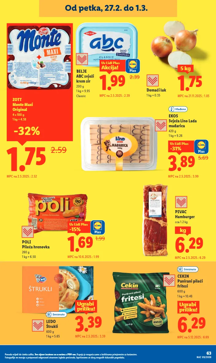 6.29 kg mpc na 2.5.2025.: 6.29 pivac hamburger cca 1.2 kg 3.39 ugrabi priliku! mpc na 2.5.2025.: 3.39 ledo štrukli 600 g 1 kg = 5.65 od petka, 27.2. do 1.3. 63 nac 09/2026 ponuda vrijedi do isteka zaliha. sve cijene izražene su u eurima s pdv-om. kupnja je moguća samo u količinama primjerenim za kućanstvo. fotografije ne moraju u potpunosti odgovarati stvarnom izgledu proizvoda. ispričavamo se zbog mogućih tiskarskih pogrešaka. cekin panirani pileći fritesi 600 g 1 kg = 10.48 6.29 ugrabi priliku! mpc na 5.12.2025.: 6.69 belje abc svježi krem sir 200 g 1 kg = 9.95 classic 2.39 1.99 akcija! uz lidl plus mpc na 2.5.2025.: 2.39 ekos svježa lino lada mađarica 420 g 1 kg = 9.26 1.75 2.59 zott monte maxi original 4 x 100 g 1 kg = 4.38 mpc na 2.5.2025.: 2.52 -32% domaći luk 1 kg = 0.35 1.75 5 kg mpc na 21.11.2025.: 1.85 poli pileća hrenovka 260 g 1 kg = 6.50 1.99 1.69 -15% uz lidl plus mpc na 10.6.2025.: 1.99 5.69 3.89 uz lidl plus mpc na 2.5.2025.: 3.99 -31%