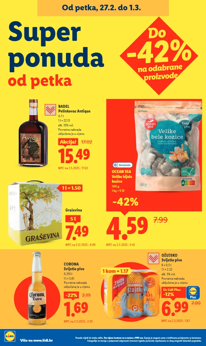 super ponuda od petka 15.49 akcija! 17.02 mpc na 2.5.2025.: 17.02 1.69 -22% 2.19 mpc na 2.5.2025.: 2.05 badel pelinkovac antique 0.7 l 1 l = 22.13 alk. 35% vol. povratna naknada uključena je u cijenu ponuda vrijedi do isteka zaliha. sve cijene izražene su u eurima s pdv-om. kupnja je moguća samo u količinama primjerenim za kućanstvo. fotografije ne moraju u potpunosti odgovarati stvarnom izgledu proizvoda. ispričavamo se zbog mogućih tiskarskih pogrešaka. više na www.lidl.hr 4.59 7.99 ocean sea velike bijele kozice 500 g 1 kg = 9.18 mpc na 2.5.2025.: 9.42 -42% corona svijetlo pivo 0,355 l 1 l = 5.61 povratna naknada uključena je u cijenu do -42% na odabrane proizvode 1 kom = 1.17 7.99 6.99 -12% uz lidl plus mpc na 2.5.2025.: 7.67 ožujsko svijetlo pivo 6 x 0,5 l 1 l = 2.22 alk. 5% vol. povratna naknada uključena je u cijenu graševina 7.49 5 l mpc na 5.12.2025.: 6.69 1 l = 1.50 od petka, 27.2. do 1.3.