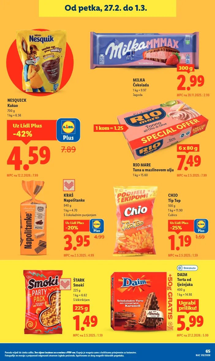 1.59 1.19 -25% uz lidl plus mpc na 2.5.2025.: 1.59 chio tip top 100 g 1 kg = 11.90 cubics 4.99 3.95 -20% uz lidl plus mpc na 2.5.2025.: 4.99 kraš napolitanke 840 g 1 kg = 4.70 s čokoladnim punjenjem daim torta od lješnjaka 400 g 1 kg = 14.98 5.99 ugrabi priliku! mpc na 27.2.2026.: 5.99 1.49 225 g mpc na 2.5.2025.: 1.59 65 nac 09/2026 ponuda vrijedi do isteka zaliha. sve cijene izražene su u eurima s pdv-om. kupnja je moguća samo u količinama primjerenim za kućanstvo. fotografije ne moraju u potpunosti odgovarati stvarnom izgledu proizvoda. ispričavamo se zbog mogućih tiskarskih pogrešaka. od petka, 27.2. do 1.3. štark smoki 225 g 1 kg = 6.62 s kikirikijem rio mare tuna u maslinovom ulju 1 kg = 15.60 7.49 6 x 80 g mpc na 2.5.2025.: 7.99 milka čokolada 1 kg = 9.97 jagoda 2.99 300 g mpc na 28.11.2025.: 2.99 1 kom = 1.25 nesquick kakao 700 g 1 kg = 6.56 uz lidl plus -42% 4.59 7.89 mpc na 12.2.2026.: 7.99