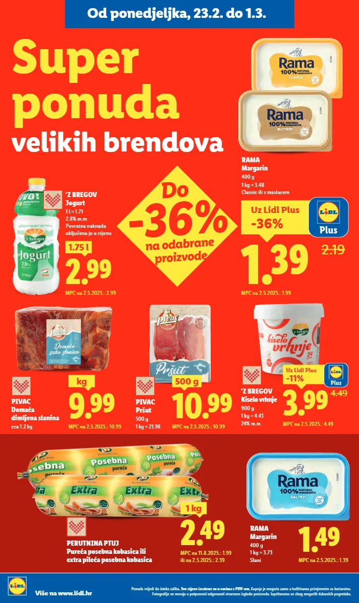 perutnina ptuj pureća posebna kobasica ili extra pileća posebna kobasica pivac pršut 500 g 1 kg = 21.98 pivac domaća dimljena slanina cca 1.2 kg 1.49 mpc na 2.5.2025.: 1.39 rama margarin 400 g 1 kg = 3.73 slani 9.99 kg mpc na 2.5.2025.: 10.99 2.99 1.75 l mpc na 2.5.2025.: 2.99 2.49 1 kg mpc na 11.8.2025.: 1.99 ili na 2.5.2025.: 2.39 'z bregov jogurt 1 l = 1.71 2.8% m.m povratna naknada uključena je u cijenu 10.99 500 g mpc na 2.5.2025.: 10.99 super ponuda velikih brendova do -36% na odabrane proizvode rama margarin 400 g 1 kg = 3.48 classic ili s maslacem uz lidl plus -36% 1.39 2.19 mpc na 2.5.2025.: 1.99 'z bregov kiselo vrhnje 900 g 1 kg = 4.43 24% m.m. 4.49 3.99 -11% uz lidl plus mpc na 2.5.2025.: 4.49 ponuda vrijedi do isteka zaliha. sve cijene izražene su u eurima s pdv-om. kupnja je moguća samo u količinama primjerenim za kućanstvo. fotografije ne moraju u potpunosti odgovarati stvarnom izgledu proizvoda. ispričavamo se zbog mogućih tiskarskih pogrešaka. više na www.lidl.hr od ponedjeljka, 23.2. do 1.3.