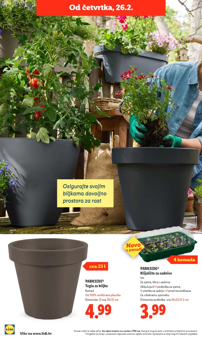 ponuda vrijedi do isteka zaliha. sve cijene izražene su u eurima s pdv-om. kupnja je moguća samo u količinama primjerenim za kućanstvo. fotografije ne moraju u potpunosti odgovarati stvarnom izgledu proizvoda. ispričavamo se zbog mogućih tiskarskih pogrešaka. više na www.lidl.hr 3.99 parkside® klijalište za sadnice set za sjeme, klice i sadnice uključujući 4 podloška za sjeme, 4 umetka za sadnju i 4 prozirna poklopca za višekratnu upotrebu dimenzije podloška: cca 36x22x11.5 cm 4.99 parkside® tegla za biljke komad od 100% reciklirane plastike dimenzije: ø cca 39x35 cm cca 23 l osigurajte svojim biljkama dovoljno prostora za rast od četvrtka, 26.2. novo u ponudi 4 komada